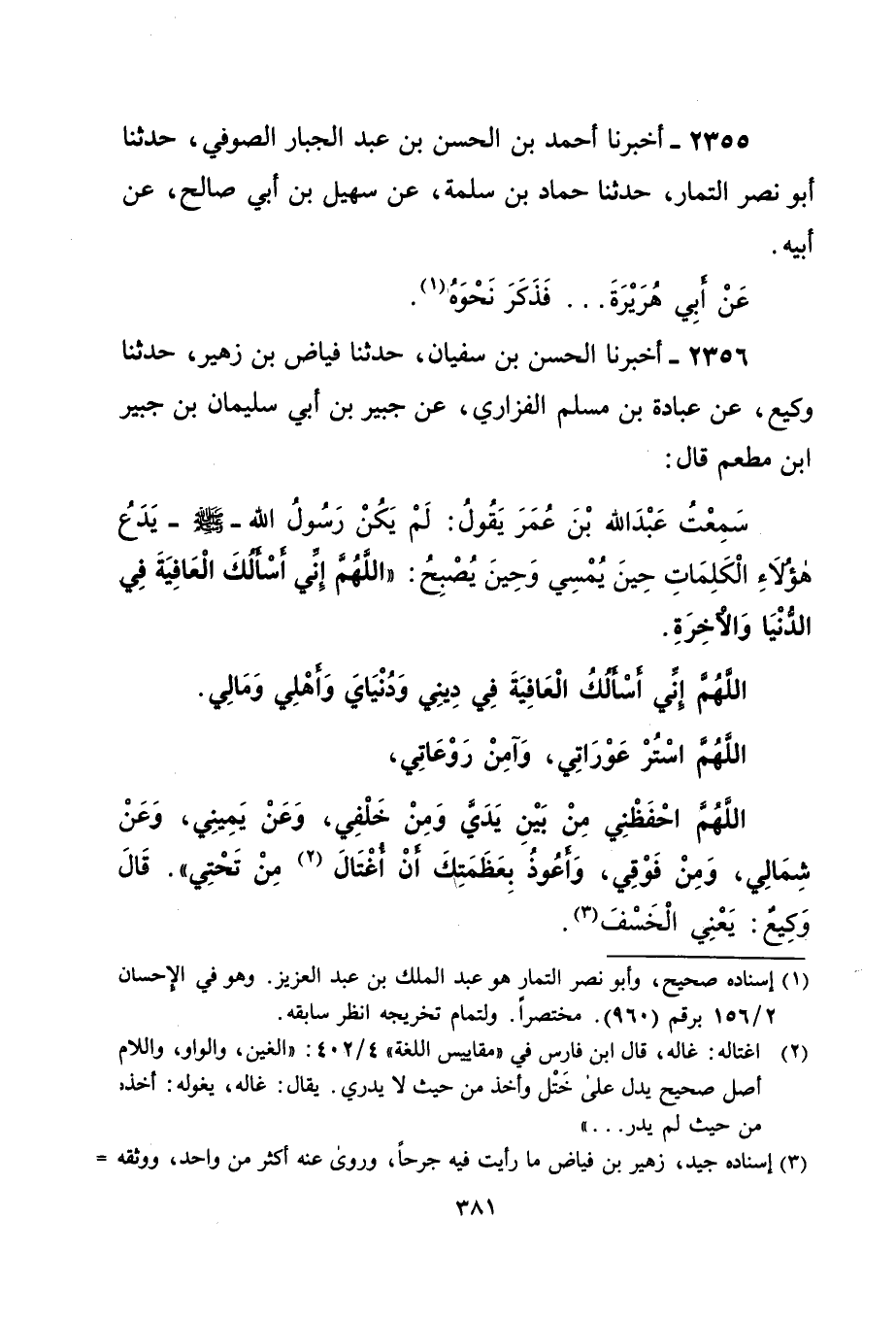 سَمِعْتُ عَبْدَ الله بْنَ عُمَرَ يَقُولُ: لَمْ يَكُنْ رَسُولُ الله -صلى الله عليه وسلم-يَدَعُ هؤلاَءِ الْكَلِمَاتِ حِينَ يُمْسِي وَحِينَ يُصْبِحُ: "اللَّهُمَّ إنِّي أَسْألكَ الْعَافِيَةَ فِي الدُّنْيَا وَالأخِرَةِ. اللهم إنِّي أَسْالكُ الْعَافِيَةَ فِي دِينِي وَدُنْيَايَ وَأهْلِي وَمَالِي. اللَّهمَّ اسْتُرْ عَوْرَاتِي، وَآمِنْ رَوْعَاتِي، اللهم احْفَظْنِي مِنْ بَيْنِ يدى وَمِنْ خَلْفِي، وَعَنْ يَمِينِي، وَعَنْ شِمَالِي، وَمِنْ فَوْقِي، وَأعُوذُ بِعَظَمَتِك أنْ أُغتَالَ (¬2) مِنْ تَحْتِي". قَالَ وَكِيعٌ: يَعْنِي الْخَسْفَ (¬3).