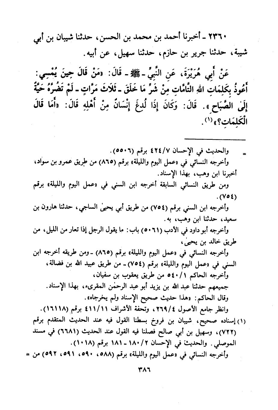 عَنْ أَبِي هُرَيْرَةَ، عَنِ النَّبِيِّ -صلى الله عليه وسلم-قَالَ: "مَنْ قَالَ حِينَ يُمْسِي: أَعُوذُ بِكَلِمَاتِ الله التَّامَّاتِ مِنْ شَرِّ مَا خَلَقَ- ثَلاثَ مَرَّاتٍ- لَمْ تَضُرَّهُ حَيَّةٌ إلَى الصَّبَاحِ". قَالَ: وَكَانَ إذَا لُدغَ إنْسَانٌ مِنْ أَهْلِهِ قَالَ: "أَمَا قَالَ الْكَلِمَاتِ؟ (¬1).
