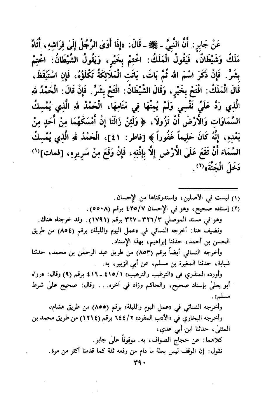 عَنْ جَابرٍ: أنَّ النَّبِيَّ -صلى الله عليه وسلم- قَالَ: "إذَا- أَوى الرَّجُلُ إلَى فِرَاشِهِ، أَتَاهُ ملكٌ وَشَيْطَانٌ، فَيَقُولُ الْمَلَكُ: اخْتِمْ بِخَيْرٍ، وَيَقُولُ الشيْطَان: اخْتمْ بشرٍّ. فَإِنْ ذَكَرَ اسْمَ الله ثُمَّ بَاتَ، بَاتَت الْمَلاَئِكَةُ تَكْلَؤُهُ، فَإنِ اسْتَيْقَظَ: قَالَ الْمَلَكُ: افْتَح بِخَيْرٍ، وَقَالَ الشَّيْطَانُ: افْتَحْ بِشَرٍّ. فإن قالَ: الْحَمْدُ للهِ الَّذى رَدَّ عَلَيَّ نفْسِي وَلَمْ يُمِتْهَا فِي مَنَامِهَا، الْحَمْدُ للهِ الذِي يُمْسِكُ السَّمَاوَات وَالأرْضَ أنْ تَزُولا، {وَلَئِنْ زَالَتَا إِنْ أَمْسَكَهُمَا مِنْ أَحَدٍ مِنْ بَعْدِهِ إِنَّهُ كَانَ حَلِيمًا غَفُورًا} [فاطر: 41]، الحمد للهِ الذى يُمْسِكُ السَّمَاءَ أنْ تَقَعَ عَلَى الأرْضِ إلاَّ بِإذْنِهِ، فَإنْ وَقَعَ مِنْ سَرِيرِهِ، [فمات] (¬1) دَخَلَ الْجَنَّةَ" (¬2).
