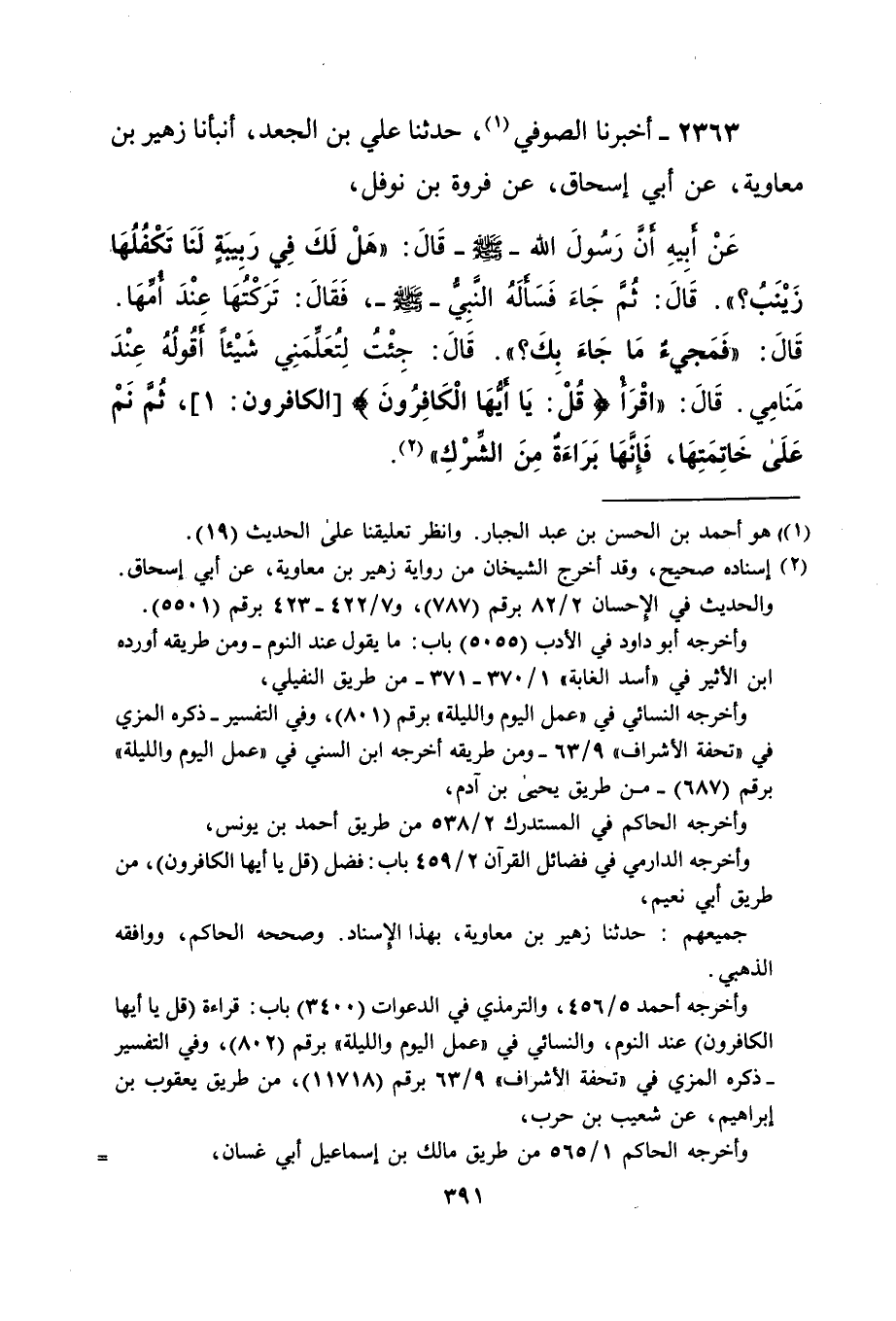 2363 - أخبرنا الصوفي (¬1)، حدثنا علي بن الجعد، أنبأنا زهير بن معاوية، عن أبي إسحاق، عن فروة بن نوفل،