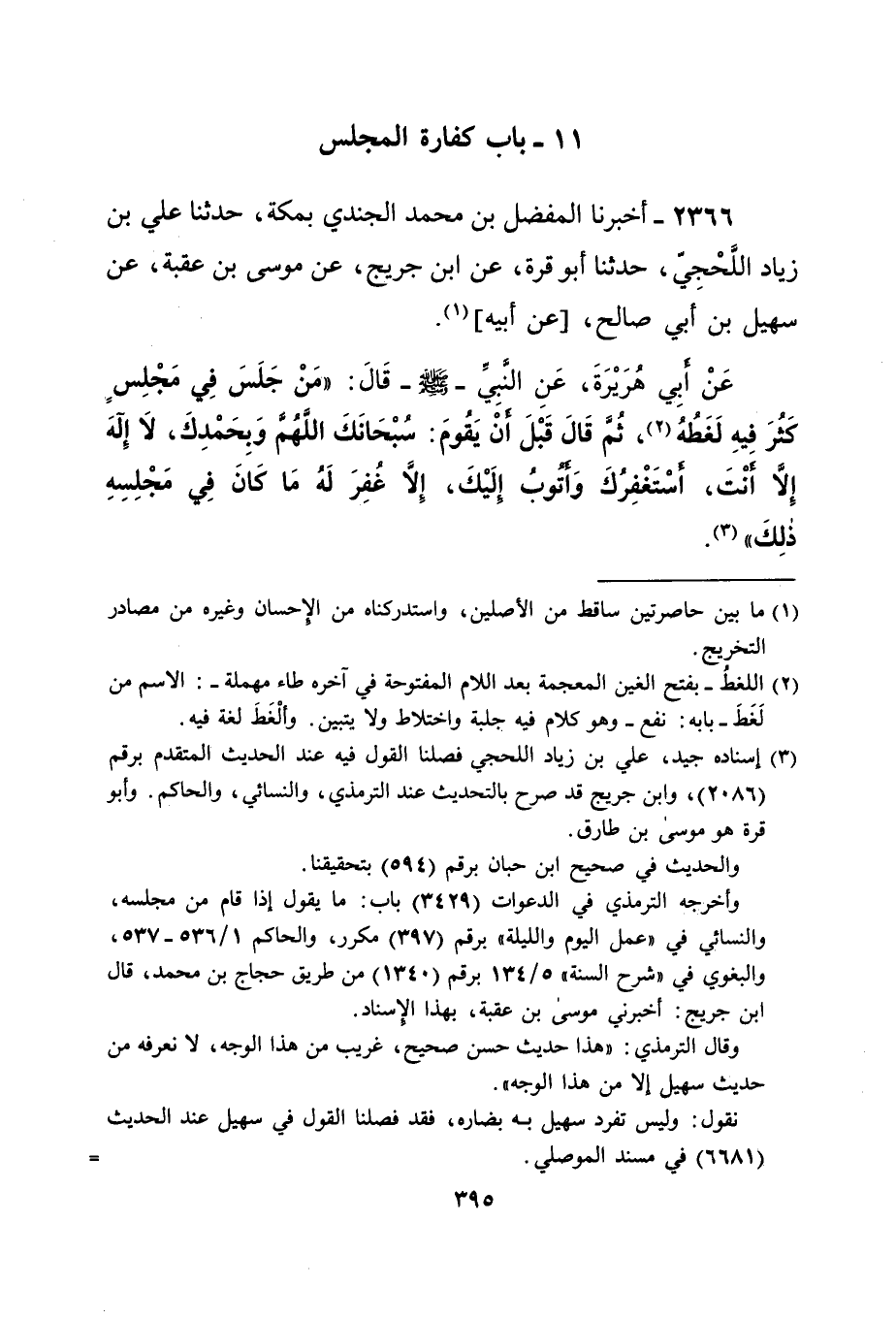 عَنْ أبِي هُرَيْرَةَ، عَنِ النَّبِيّ -صلى الله عليه وسلم- قَالَ: "مَنْ جَلَسَ فِي مَجْلِسٍ كَثُرَ فِيهِ لَغَطُهُ (¬2)، ثُمَّ قَالَ قَبْلَ أنْ يَقُومَ: سُبْحَانَكَ اللَّهُمَّ وَبِحَمْدِكَ، لا إلهَ إِلاَّ أنْتَ، أَسْتَغْفِرُكَ وَأَتوبُ إلَيْكَ، إلاَّ غُفِرَ لَهُ مَا كَانَ فِي مَجْلِسِهِ ذلِكَ" (¬3).