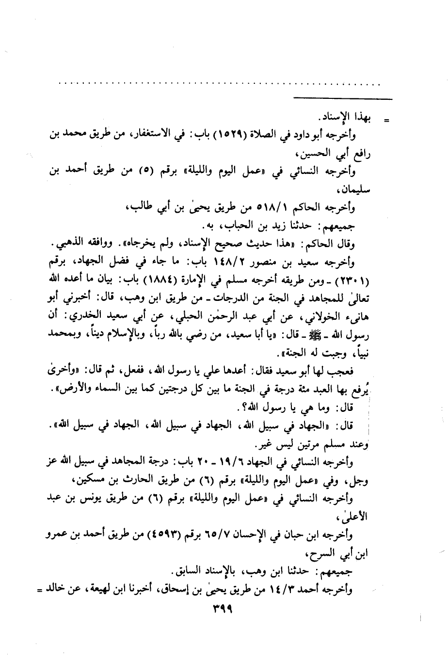 وأخرجه سعيد بن منصور 2/ 148 باب: ما جاء في فضل الجهاد، برقم (2301) - ومن طريقه أخرجه مسلم في الإمارة (1884) باب: بيان ما أعده الله تعالى للمجاهد في الجنة من الدرجات- من طريق ابن وهب، قال: أخبرني أبو هانئ الخولاني، عن أبي عبد الرحمن الحبلي، عن أبي سعيد الخدري: أن رَسُول الله -صلى الله عليه وسلم-قال: "يا أبا سعيد، من رضي بالله رباً، وبالإسلام ديناً، وبمحمد نبياً، وجبت له الجنة".