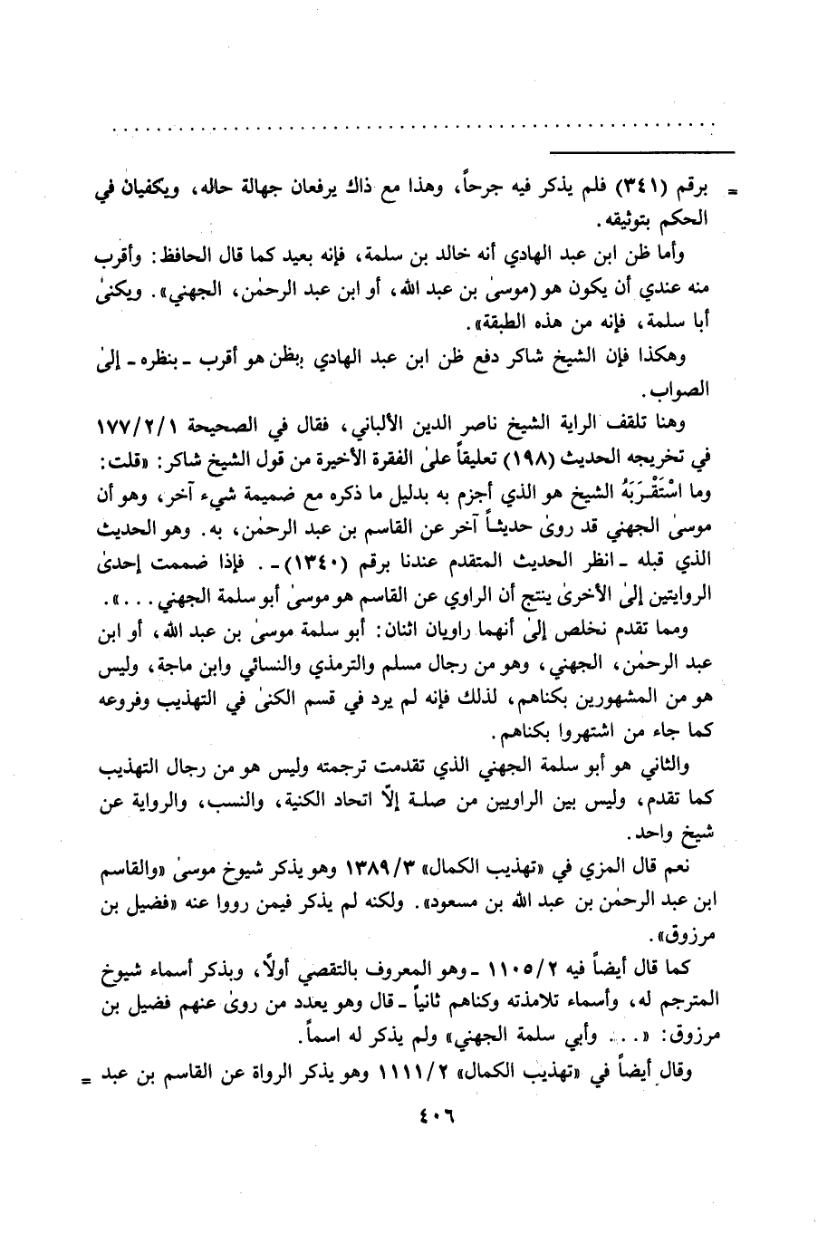 وأما ظن ابن عبد الهادي أنه خالد بن سلمة، فإنه بعيد كما قال الحافظ: وأقرب منه عندي أن يكون هو (موسى بن عبد الله، أو ابن عبد الرحمن، الجهني". ويكنى أبا سلمة، فإنه من هذه الطبقة".