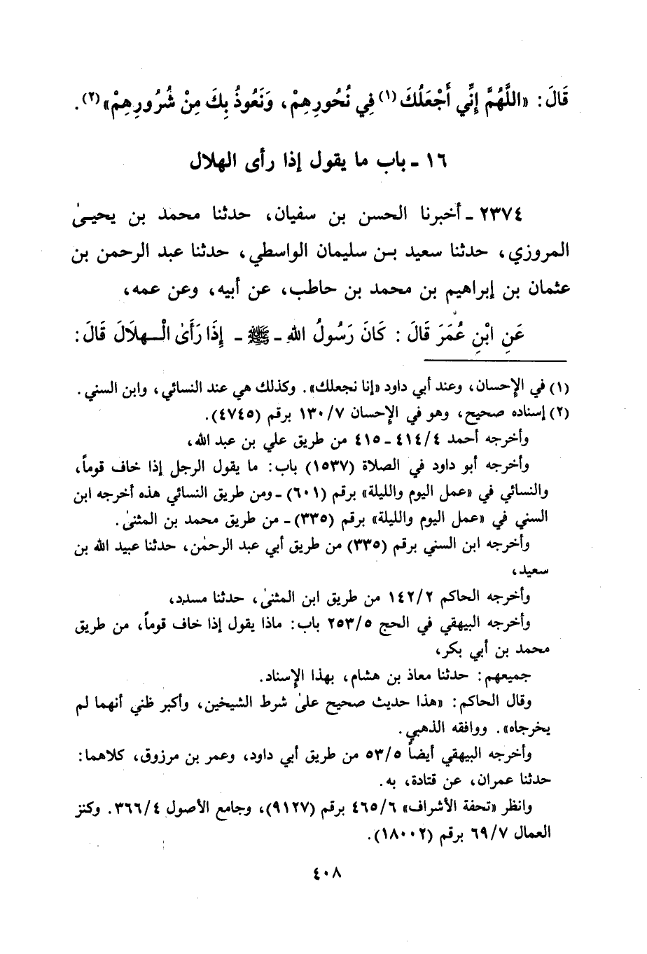 عَنِ ابْنِ عُمَرَ قَالَ: كَانَ رَسُولُ الله -صلى الله عليه وسلم- إِذا رَأَى الْهلاَلَ قَالَ: