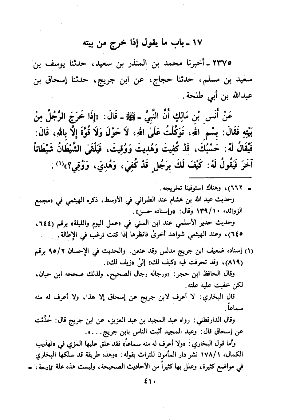 عَنْ أنَسِ بْنِ مَالِكٍ أَنَّ النَّبِيَّ -صلى الله عليه وسلم-قَالَ: "ْإذَا خَرَجَ الرَّجُلُ مِنْ بَيْتِهِ فَقَالَ: بِسْمِ اللهِ، تَوَكَّلْتُ عَلَى اللهِ، لاَ حَوْلَ وَلاَ قُوَّةَ إلا بِاللهِ، قَالَ: فَيُقَالُ لَهُ: حَسْبُكَ، قَدْ كُفِيتَ وَهُدِيتَ وَوُقِيتَ، فَيَلْقَى الشَّيْطَانُ شَيْطَاناً آخَرَ فَيَقُولُ لَهْ: كَيْفَ لَكَ برَجُل قَدْ كُفِيَ، وَهُدِيَ، وَوُقِي؟ " (¬1).