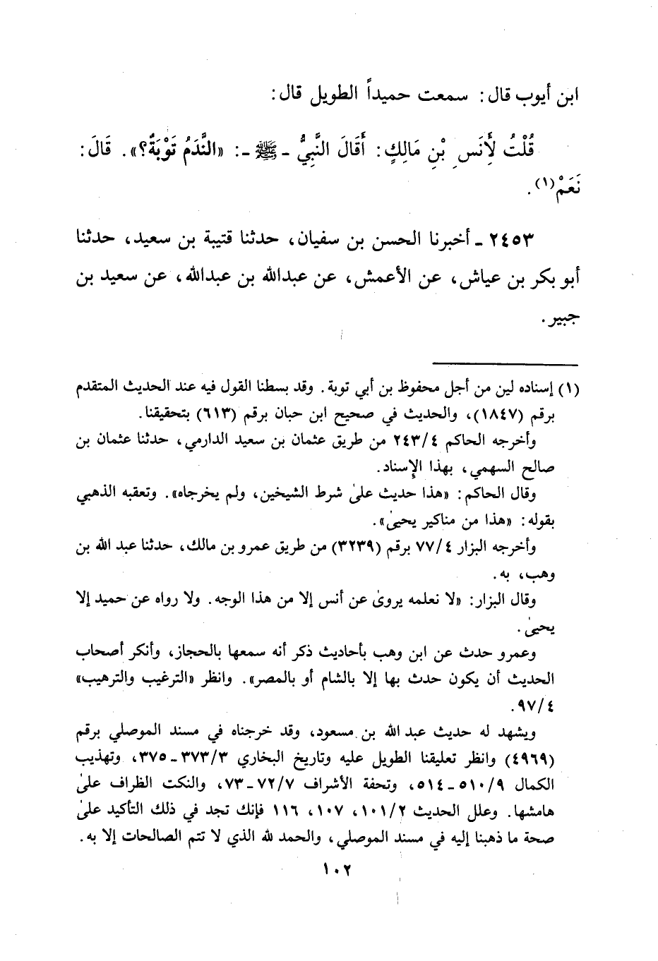 ابن أيوب قال: سمعت حميداً الطويل قال: قُلْتُ لأنَسِ بْنِ مَالِكٍ: أَقَالَ النَّبِيُّ -صلى الله عليه وسلم-: "النَّدَمُ تَوْبَةٌ؟ ". قَالَ: نَعَمْ (¬1).