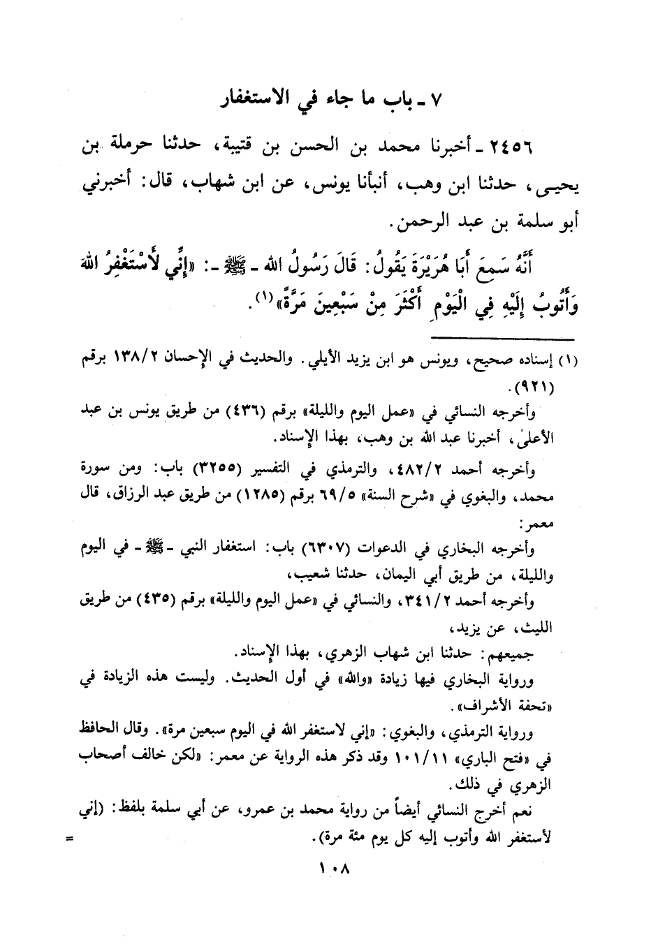 أنَّهُ سَمعَ أَبَا هريرة يَقُولُ: قَالَ رَسُولُ الله- صلى الله عليه وسلم-"إنِّي لأستَغْفِرُ اللهَ وَأتُوبُ إِلَيْهِ فِي الْيَوْمِ أكْثَرَ مِنْ سَبْعِينَ مَرَّةً" (¬1).