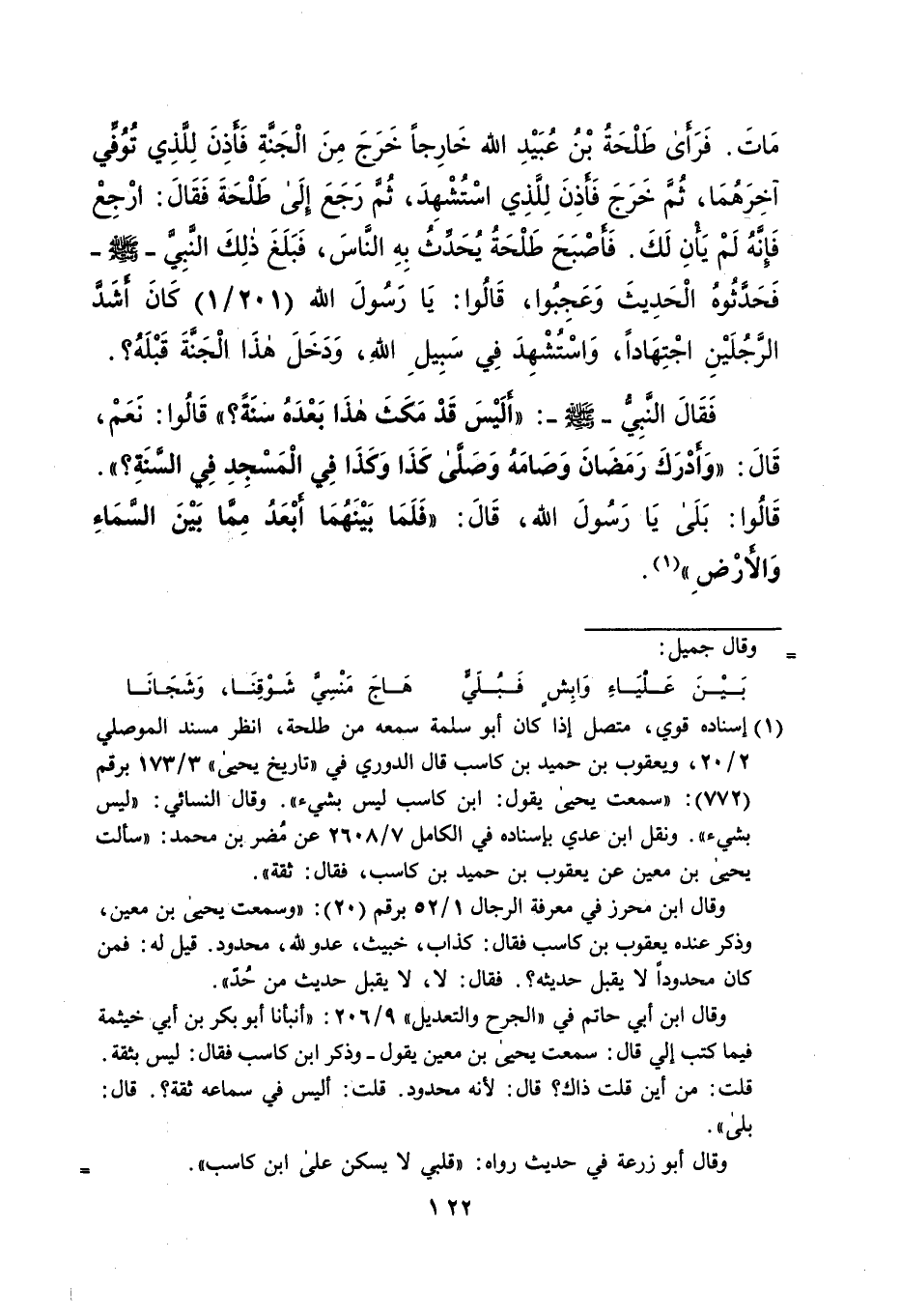(¬1) إسناده قوي، متصل إذا كان أبو سلمة سمعه من طلحة، انظر مسند الموصلي 2/ 20، ويعقوب بن حميد بن كاسب قال الدوري في "تاريخ يحيى" 3/ 173 برقم (772): "سمعت يحيى يقول: ابن كاسب ليس بشيء". وقال- النسائي: "ليس بشيء". ونقل ابن عدي بإسناده في الكامل 7/ 2608 عن مُضر بن محمد: "سألت يحيى بن معين عن يعقوب بن حميد بن كاسب، فقال: ثقة".