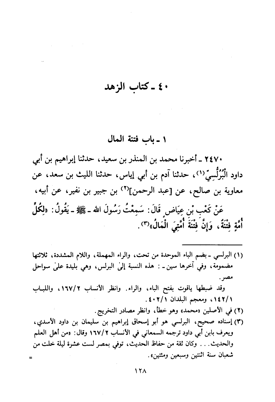 معاوية بن صالح، عن [عبد الرحمن] (¬2) بن جبير بن نفير، عن أبيه، عَنْ كَعْبِ بْنِ عيَاضٍ قَالَ: سَمِعْتُ رَسُولَ الله -صلى الله عليه وسلم- يَقُولُ: "لِكُلِّ أُمَّةٍ فِتْنَةٌ، وَإنَّ فِتْنَةَ أُمَّتِيَ الْمَالُ" (¬3).