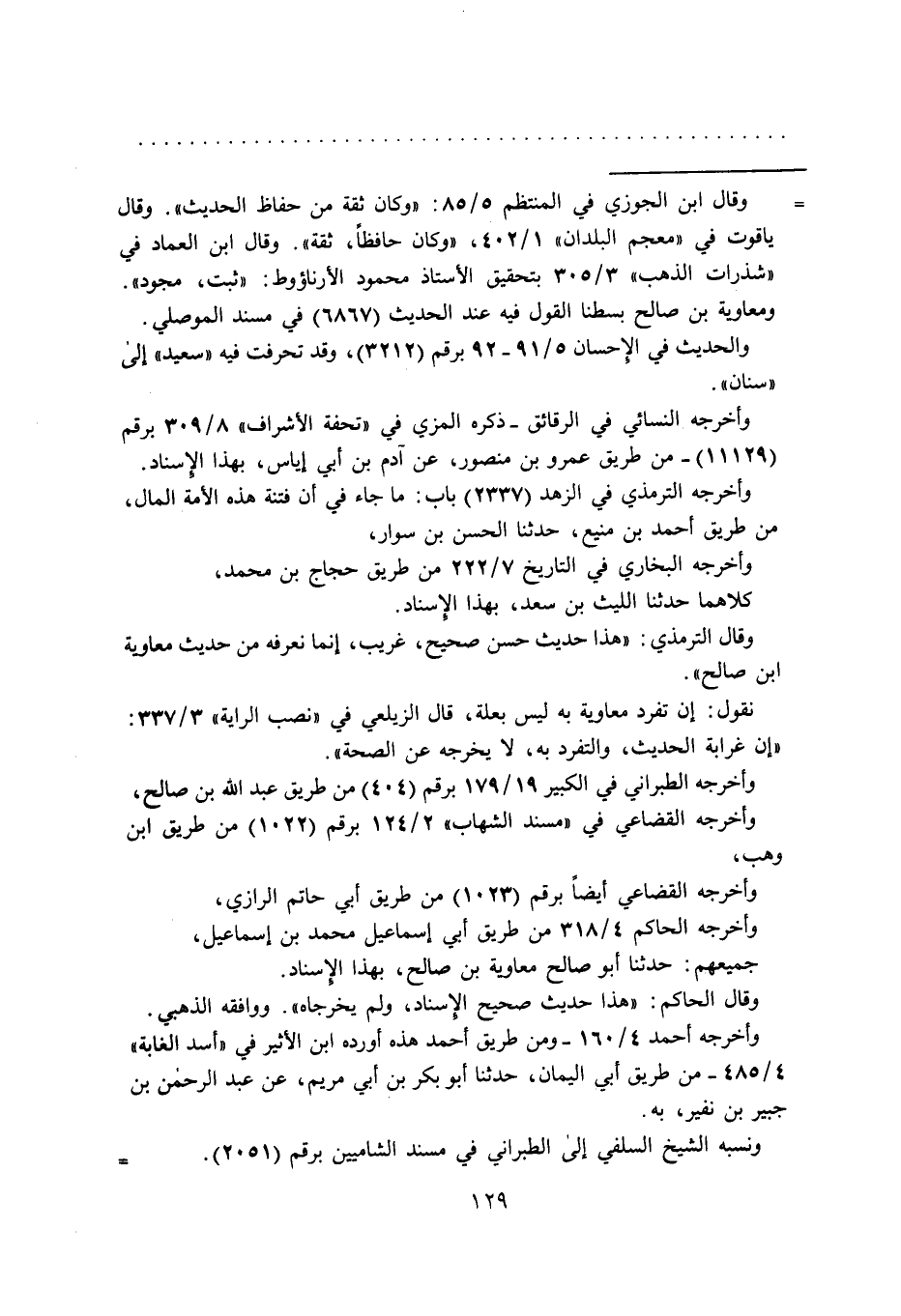 وقال الترمذي: "هذا حديث حسن صحيح، غريب، إنما نعرفه من حديث معاوية ابن صالح".