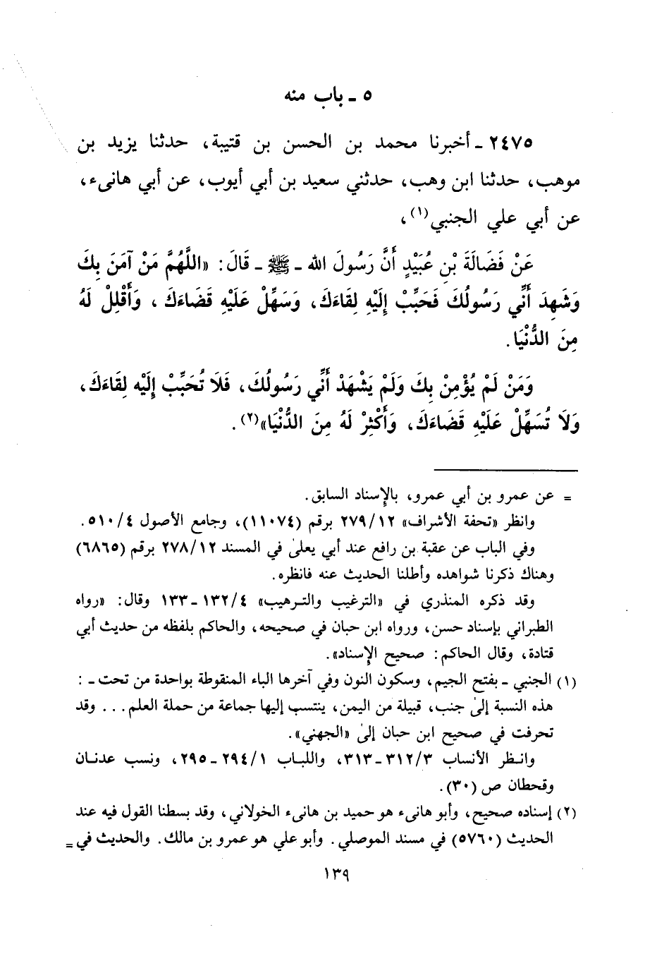 عَنْ فَضَالَةَ بْنِ عُبَيْدٍ أنَ رَسُول الله -صلى الله عليه وسلم- قَالَ: "اللَّهم مَنْ آمَنَ بِكَ وَشَهِدَ أَنِّي رَسُولُكَ فَحَبِّبْ إِلَيْهِ لِقَاءَكَ، وَسَهِّلْ عَلَيْهِ قَضَاءَكَ، وَأَقْلِلْ لَهُ مِنَ الدُّنْيَا. وَمَنْ لَمْ يُؤْمِنْ بِكَ وَلَمْ يَشْهَدْ أَنِّي رَسُولُكَ، فَلا تُحَبِّبْ إلَيْه لِقَاءَكَ، وَلا تُسَهِّلْ عَلَيْهِ قَضَاءَكَ، وَأَكْثِرْ لَهُ مِنَ الدّنْيَا" (¬2).