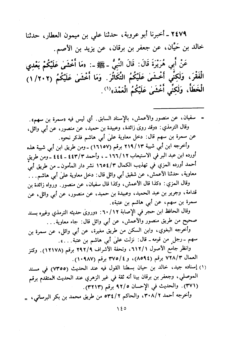 عَنْ أبي هُرَيْرَةَ قَالَ: قَالَ النَّبِيُّ -صلى الله عليه وسلم-: "مَا أَخْشَى عَلَيْكُمْ بَعْدِي الْفَقْرَ، وَلكِنِّي أَخْشَى عَلَيْكُمُ التَّكَاثُرَ. وَمَا أَخْشَى عَلَيْكُمُ (202/ 1) الْخَطَأَ، وَلكِنِّي أَخْشَى عَلَيْكُمُ الْعَمْدَ" (¬1).