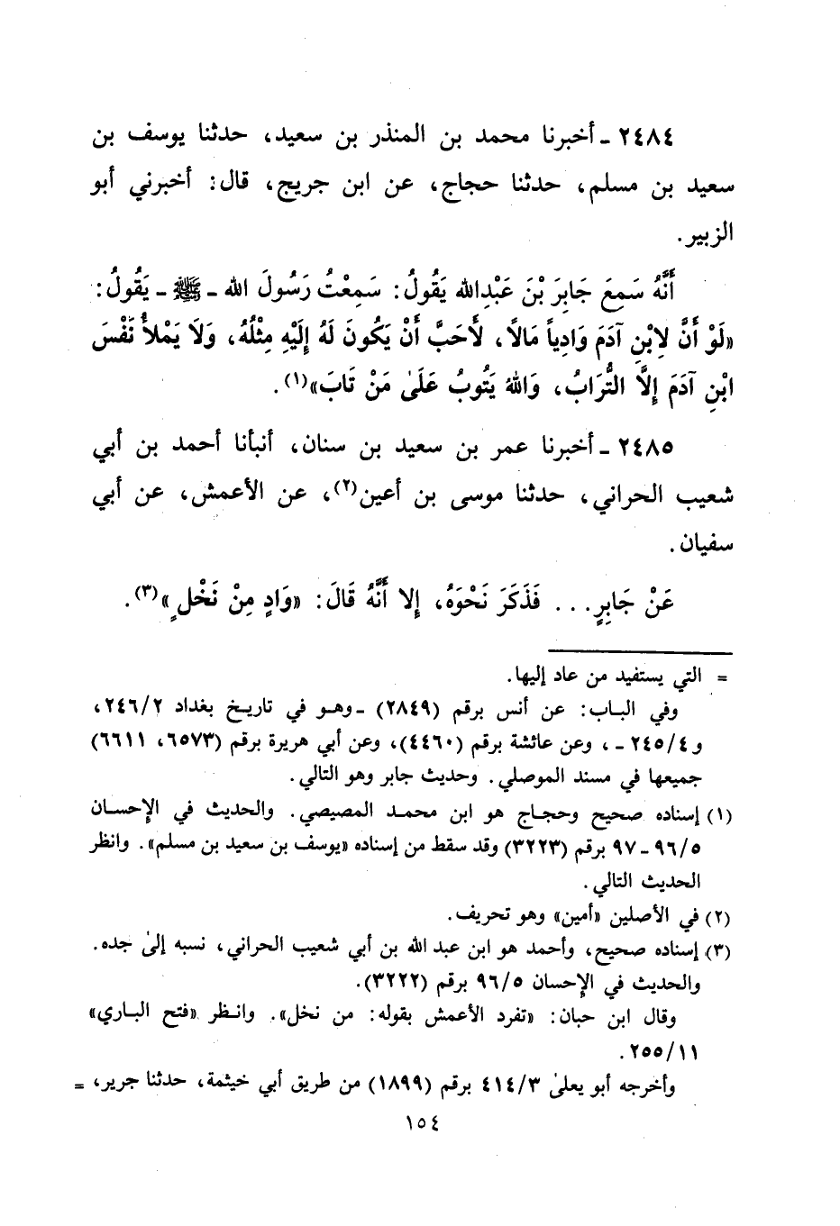 ْأَنَّهُ سَمِعَ جَابِرَ بْنَ عَبْدِ الله يَقُولُ: سَمِعْتُ رَسولَ الله -صلى الله عليه وسلم- يَقُولُ: "لَوْ أنَّ لاِبْنِ آدَمَ وَادِياً مَالاً، لأَحَبَّ أنْ يَكُونَ لَهُ إلَيْهِ مِثْلُهُ، وَلا يَمْلأُ نَفْسَ ابْنِ آدَمَ إلاَّ التُّرَابُ، وَاللهُ يَتُوبُ عَلَى مَنْ تَابَ" (¬1).