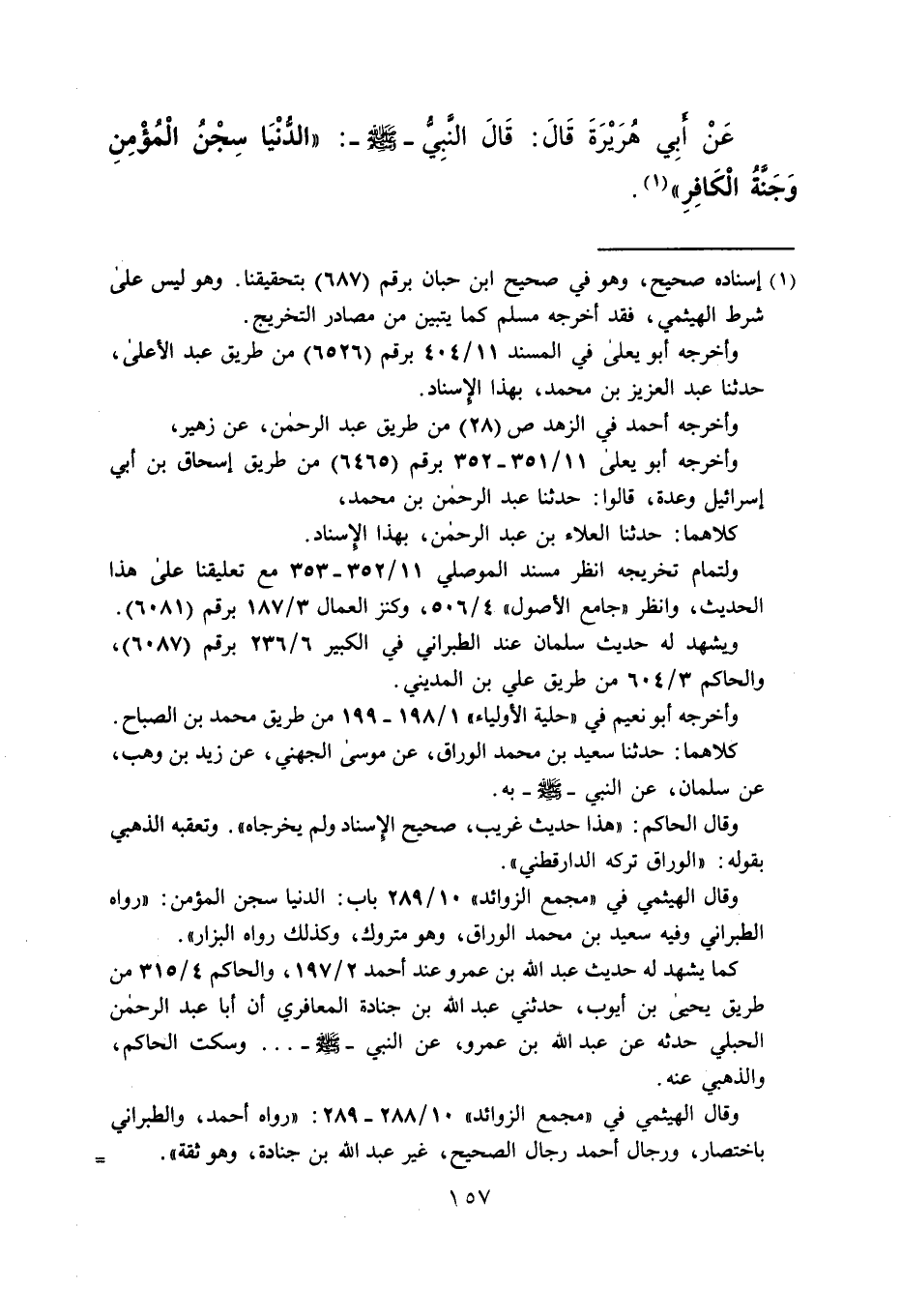 عَنْ أبِي هُرَيْرَةَ قَالَ: قَالَ النبِيُّ -صلى الله عليه وسلم-: "الدُّنْيَا سِجْنُ الْمُؤْمِنِ وَجَنَّةُ الْكَافِرِ" (¬1).