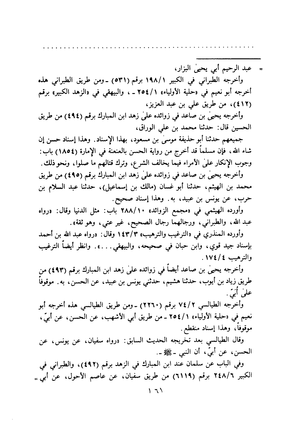 = عبد الرحيم أبي يحيى البزار، وأخرجه الطبراني في الكبير 1/ 198 برقم (531) - ومن طريق الطبراني هذه أخرجه أبو نعيم في "حلية الأولياء" 1/ 254 - ، والبيهقي في "الزهد الكبير" برقم (412)، من طريق علي بن عبد العزيز، وأخرجه يحيى بن صاعد في زوائده على زهد ابن المبارك برقم (494) من طريق الحسين قال: حدثنا محمد بن علي الوراق، جميعهم حدثنا أبو حذيفة موسى بن مسعود، بهذا الإسناد. وهذا إسناد حسن إن شاء الله، فإن مسلماً قد أخرج من رواية الحسن بالعنعنة في الأمارة (1854) باب: وجوب الإنكار على الأمراء فيما يخالف الشرع، وترك قتالهم ما صلوا، ونحو ذلك.