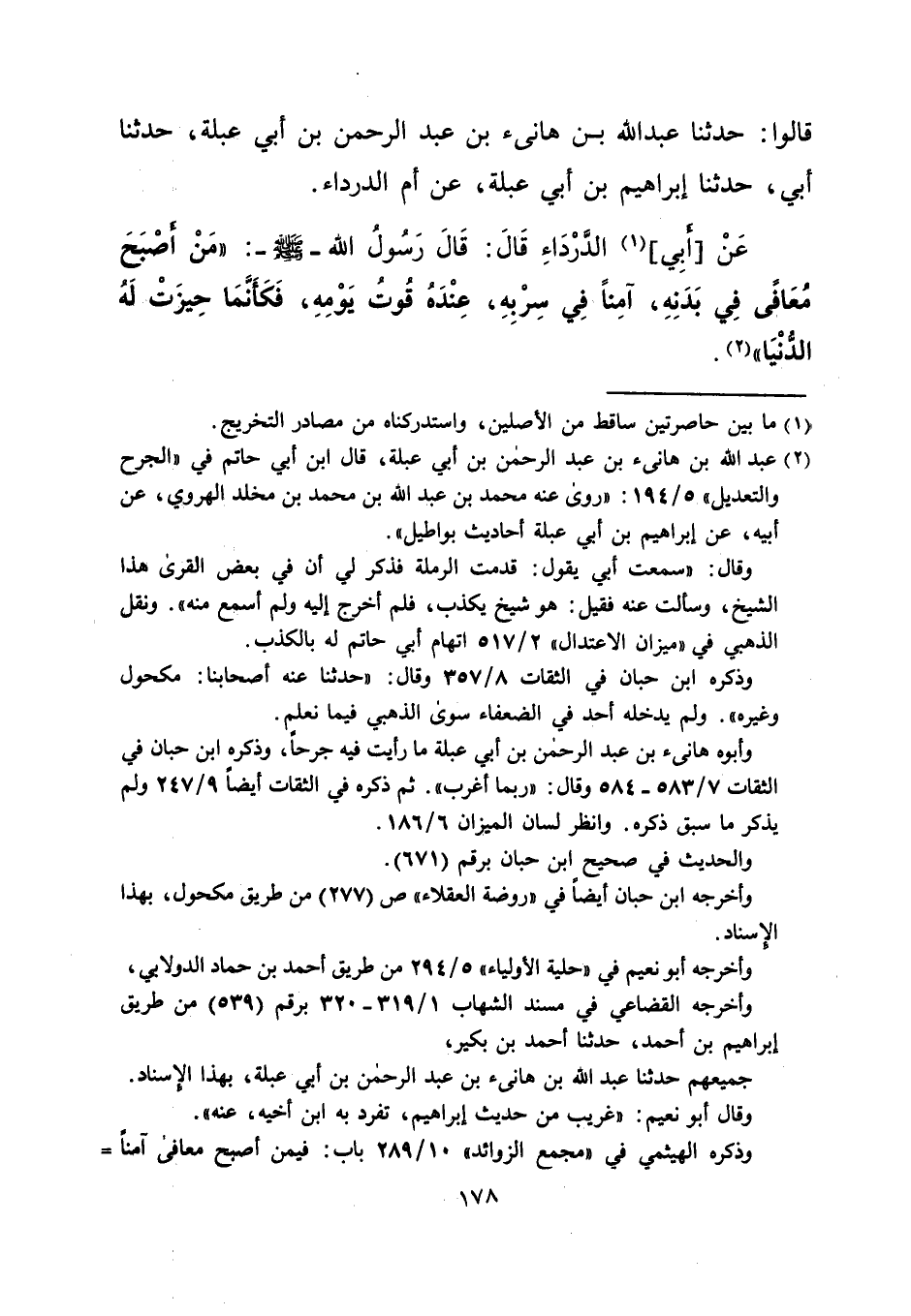 وذكره الهيثمي في "مجمع الزوائد" 10/ 289 باب: فيمن أصبح معافى آمناً =