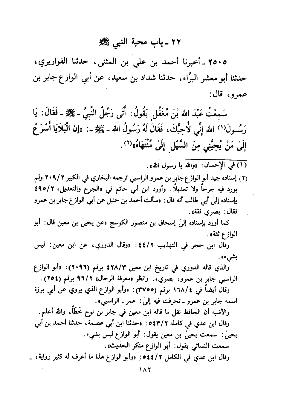سَمِعْت عَبْدَ الله بْنَ مُغَفَّل يَقُولُ: أَتَى رَجُلٌ النَّبِيَّ - صلى الله عليه وسلم - فَقَالَ: يَا رَسُولَ (¬1) اللهِ إِنِّي لأُحِبُّكَ، فَقَالَ لَه رَسُول الله -صلى الله عليه وسلم-: "إن الْبَلايَا أَسْرَعُ إلَى مَنْ يُحِبُّنِي مِنَ السَّيْلِ إِلَى مُنْتَهَاهُ" (¬2).