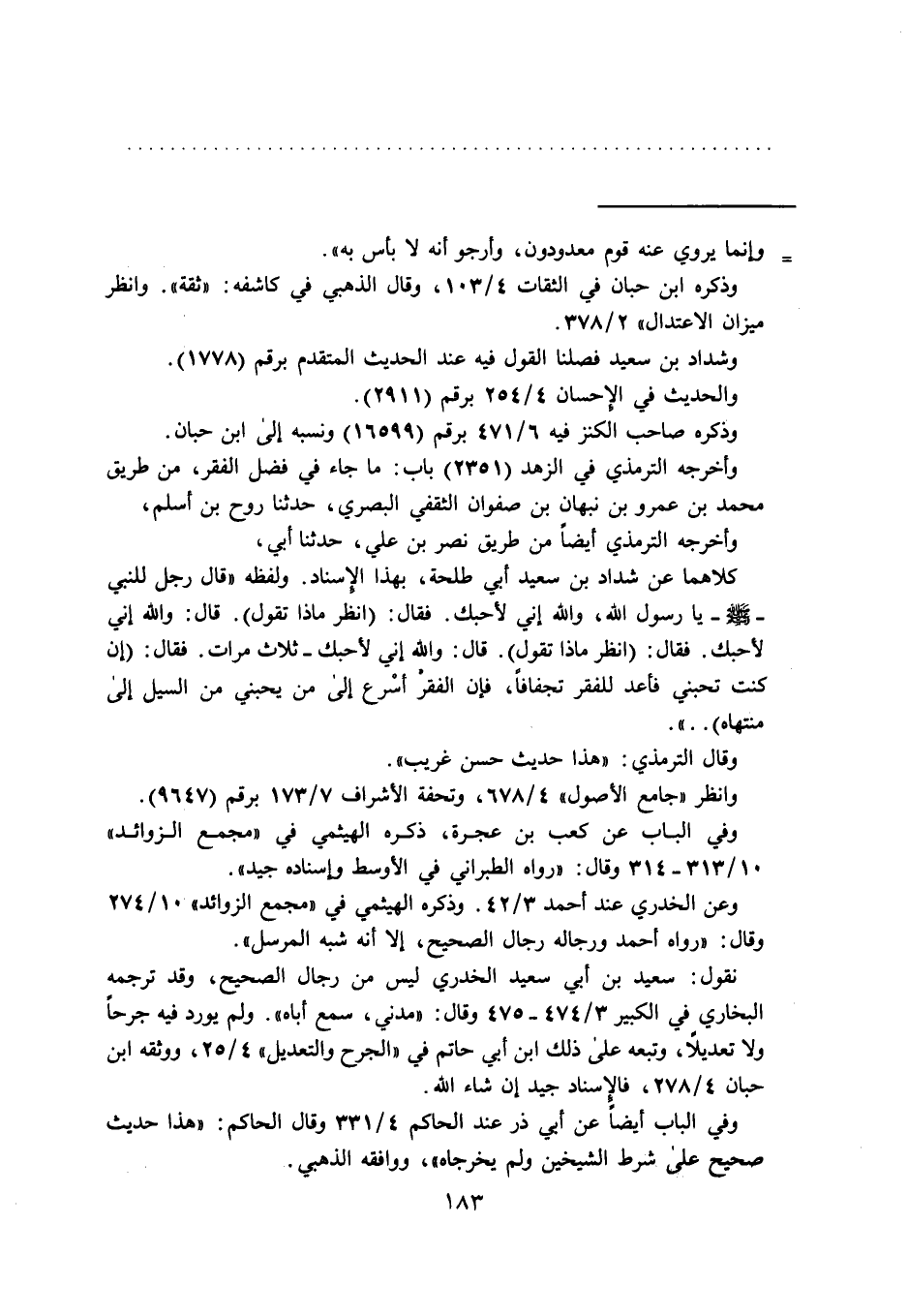 وأخرجه الترمذي في الزهد (2351) باب: ما جاء في فضل الفقر، من طريق محمد بن عمرو بن نبهان بن صفوان الثقفي البصري، حدثنا روح بن أسلم، وأخرجه الترمذي أيضاً من طريق نصر بن علي، حدثنا أبي، كلاهما عن شداد بن سعيد أبي طلحة، بهذا الإسناد. ولفظه "قال رجل للنبي -صلى الله عليه وسلم- يا رَسُول الله، والله إني لأحبك. فقال: (انظر ماذا تقول). قال: والله إني لأحبك. فقال: (انظر ماذا تقول). قال: والله إني لأحبك- ثلاث مرات. فقال: (إن كنت تحبني فأعد للفقر تجفافاً، فإن الفقر أسْرع إلى من يحبني من السيل إلى منتهاه) .. ".
