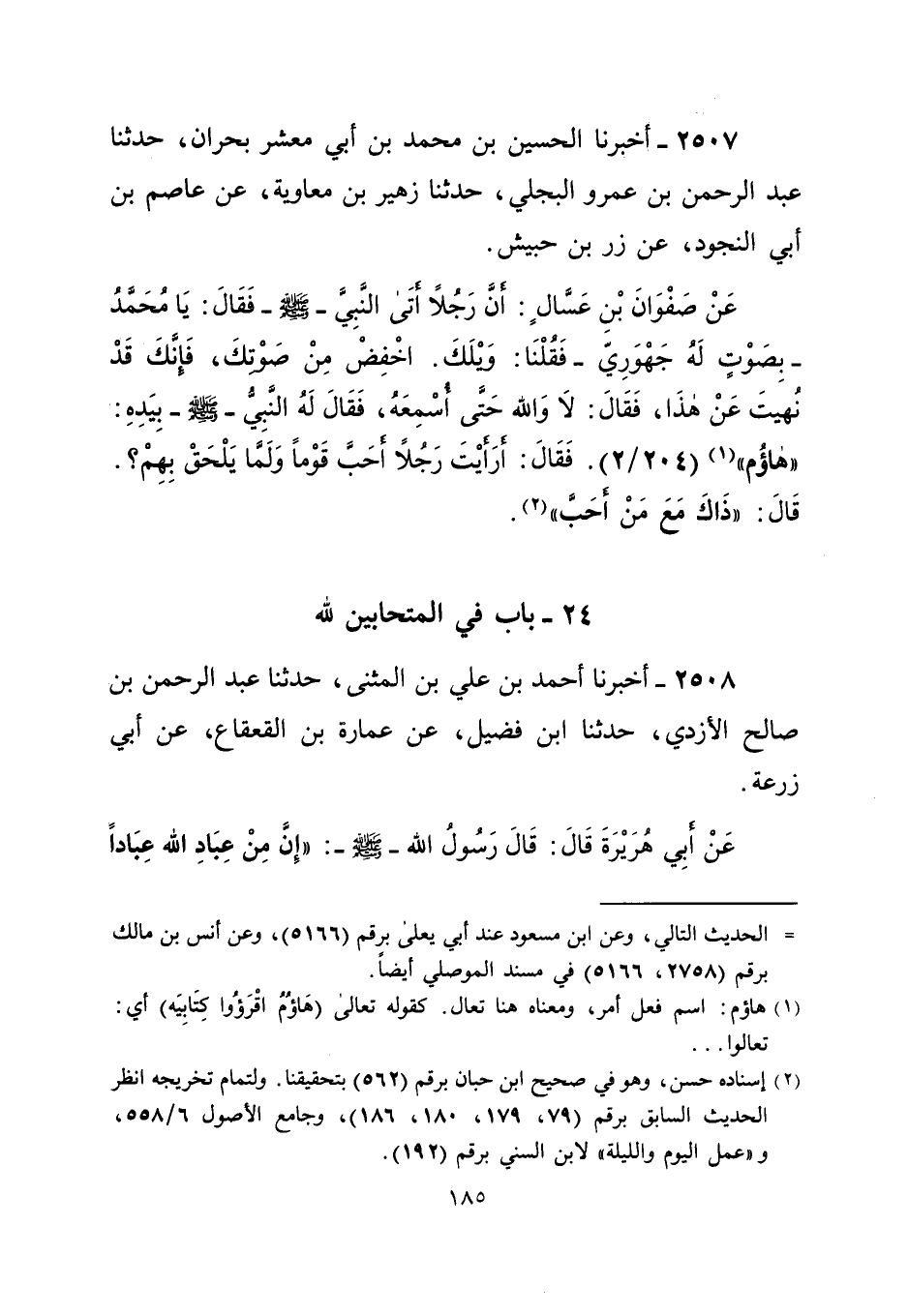 عَنْ صَفْوَانَ بْنِ عَسَّالٍ: أن رَجُلاً أَتَى النَّبِيِّ -صلى الله عليه وسلم-فَقَالَ: يَا مُحَمَّدُ - بِصَوْتٍ لَهُ جَهْوَرِيّ- فَقُلْنَا: وَيْلَكَ. اخْفِضْ مِنْ صَوْتكَ، فَإنَّكَ قَدْ نُهيتَ عَنْ هذَا، فَقَالَ: لاَ وَالله حَتَّى أُسْمِعَهُ، فَقَالَ لَهُ النَّبِيُّ -صلى الله عليه وسلم- بِيَدِهِ: "هاؤُم" (¬1) (2/ 204). فَقَالَ: أَرَأَيْتَ رَجُلاً أَحَبَّ قَوْماً وَلَمَّا يَلْحَقْ بِهِمْ؟. قَالَ: "ذَاكَ مَعَ مَنْ أَحَبَّ" (¬2).