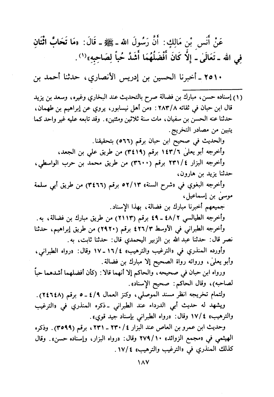 ورواه ابن حبان في صحيحه، والحاكم إلا أنهما قالا: (كان أفضلهما أشدهما حباً لصاحبه)، وقال الحاكم: صحيح الإسناد".