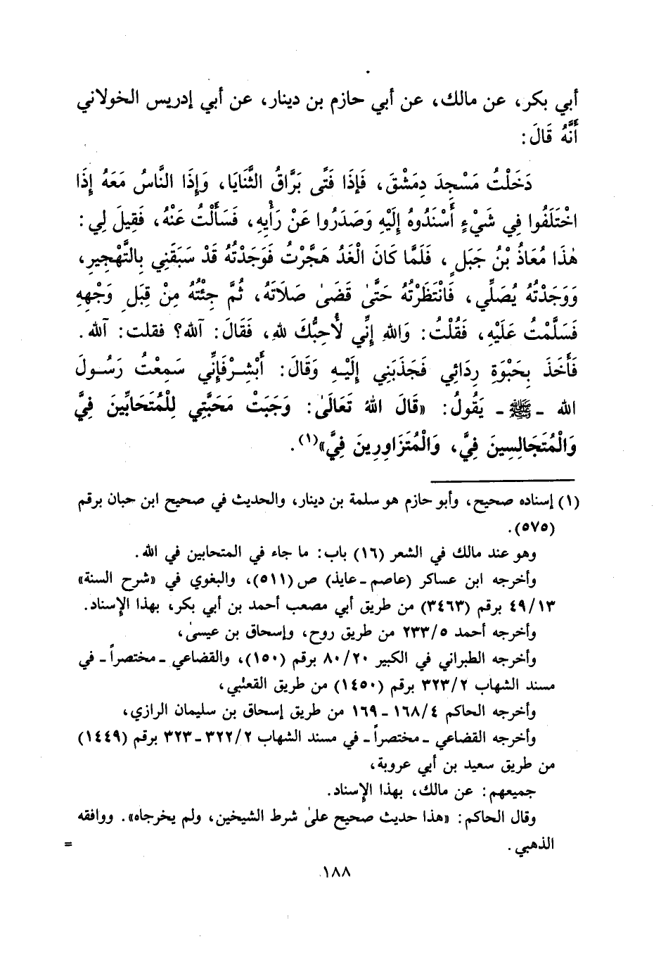 أبي بكر، عن مالك، عن أبي حازم بن دينار، عن أبي إدريس الخولاني أَنَّهُ قَالَ: دَخَلْتُ مَسْجدَ دِمَشْقَ، فَإذَا فَتًى بَرَّاقُ الثَّنَايَا، وَإذَا النَّاسُ مَعَهُ إذَا اخْتَلَفُوا فِي شَيْءٍ أَسْنَدُوهُ إِلَيْهِ وَصَدَرُوا عَنْ رَأْيِهِ، فَسَألْتُ عَنْهُ، فَقِيلَ لِي: هذَا مُعَاذُ بْنُ جَبَلٍ، فَلَمَّا كَانَ الْغَدُ هَجَّرْتُ فَوَجَدْتُهُ قَدْ سَبَقَنِي بِالتَّهْجِيرِ، وَوَجَدْتُهُ يُصَلِّي، فَانْتَظَرْتُهُ حَتى قَضَى صَلاتَهُ، ثُمَّ جِئْتُهُ مِنْ قِبَلِ وَجْهِهِ فَسَلَّمْتُ عَلَيْهِ، فَقُلْتُ: وَاللهِ إنِّي لأحِبُّكَ لله، فَقَالَ: آلله؟ فقلت: آلله. فَأخَذَ بِحَبْوَةِ رِدَائِي فَجَذَبَنِي إلَيْهِ وَقَالَ: أبْشِرْ فَإنِّي سَمِعْتُ رَسُولَ الله -صلى الله عليه وسلم- يَقُولُ: "قَالَ الله تَعَالَى: وَجَبَتْ مَحَبتِي لِلْمُتَحَابِّينَ فِيَّ وَالْمُتَجَالِسِينَ في، وَالْمُتَزَاوِرِينَ فِيَّ" (¬1).