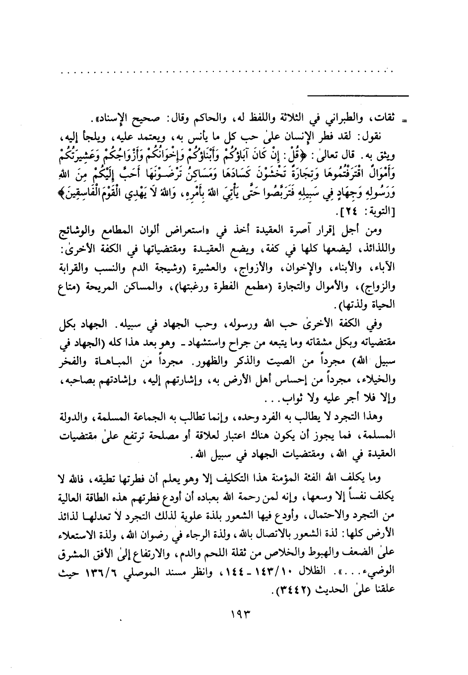 وهذا التجرد لا يطالب به الفرد وحده، وإنما تطالب به الجماعة المسلمة، والدولة المسلمة، فما يجوز أن يكون هناك اعتبار لعلاقة أو مصلحة ترتفع على مقتضيات العقيدة في الله، ومقتضيات الجهاد في سبيل الله.