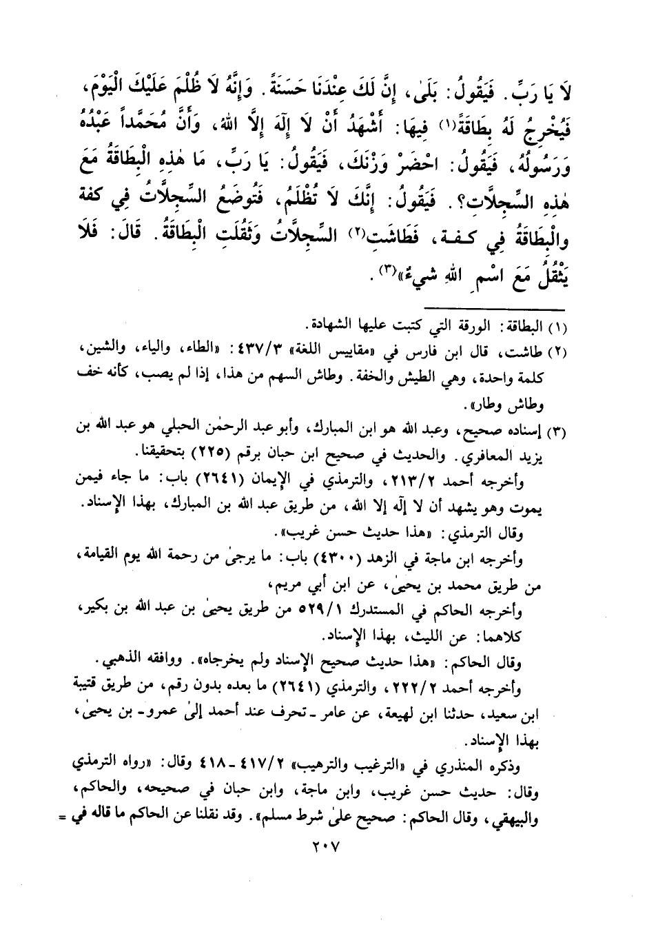 لا يَا رَبِّ. فَيَقُولُ: بَلَى، إِنَّ لَكَ عِنْدَنَا حَسَنَةً. وَإنَّهُ لاَ ظُلْمَ عَلَيْكَ الْيَوْمَ، فَيُخْرِجُ لَهُ بِطَاقَةً (¬1) فِيهَا: أَشْهَدُ أَنْ لا إله إِلاَّ اللهُ، وَأنَّ مُحَمَّداً عَبْدُهُ وَرَسُولُهُ، فَيَقُولُ: احْضَرْ وَزْنَكَ، فَيَقُولُ: يَا رَبِّ، مَا هذِهِ الْبِطَاقَةُ مَعَ هذِهِ السِّجِلَّاتِ؟. فَيَقُولُ: إِنَّكَ لا تُظْلَمُ، فَتُوضَعُ السِّجِلَّاتُ فِي كفة والْبِطَاقَةُ فِي كفة، فَطَاشَتِ (¬2) السِّجِلَّاتُ وَثَقُلَتِ الْبِطَاقَةُ. قَالَ: فَلَا يَثْقُلُ مَعَ اسْمِ اللهِ شيءٌ" (¬3).