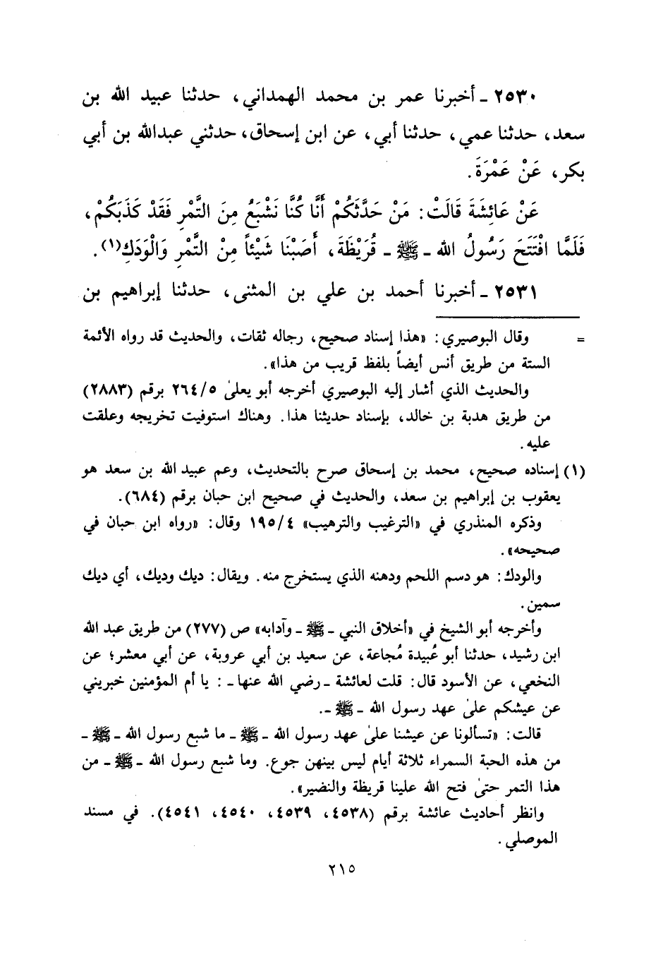 2530 - أخبرنا عمر بن محمد الهمداني، حدثنا عبيد الله بن سعد، حدثنا عمي، حدثنا أبي، عن ابن إسحاق، حدثني عبد الله بن أبي بكر، عَنْ عَمْرَةَ.