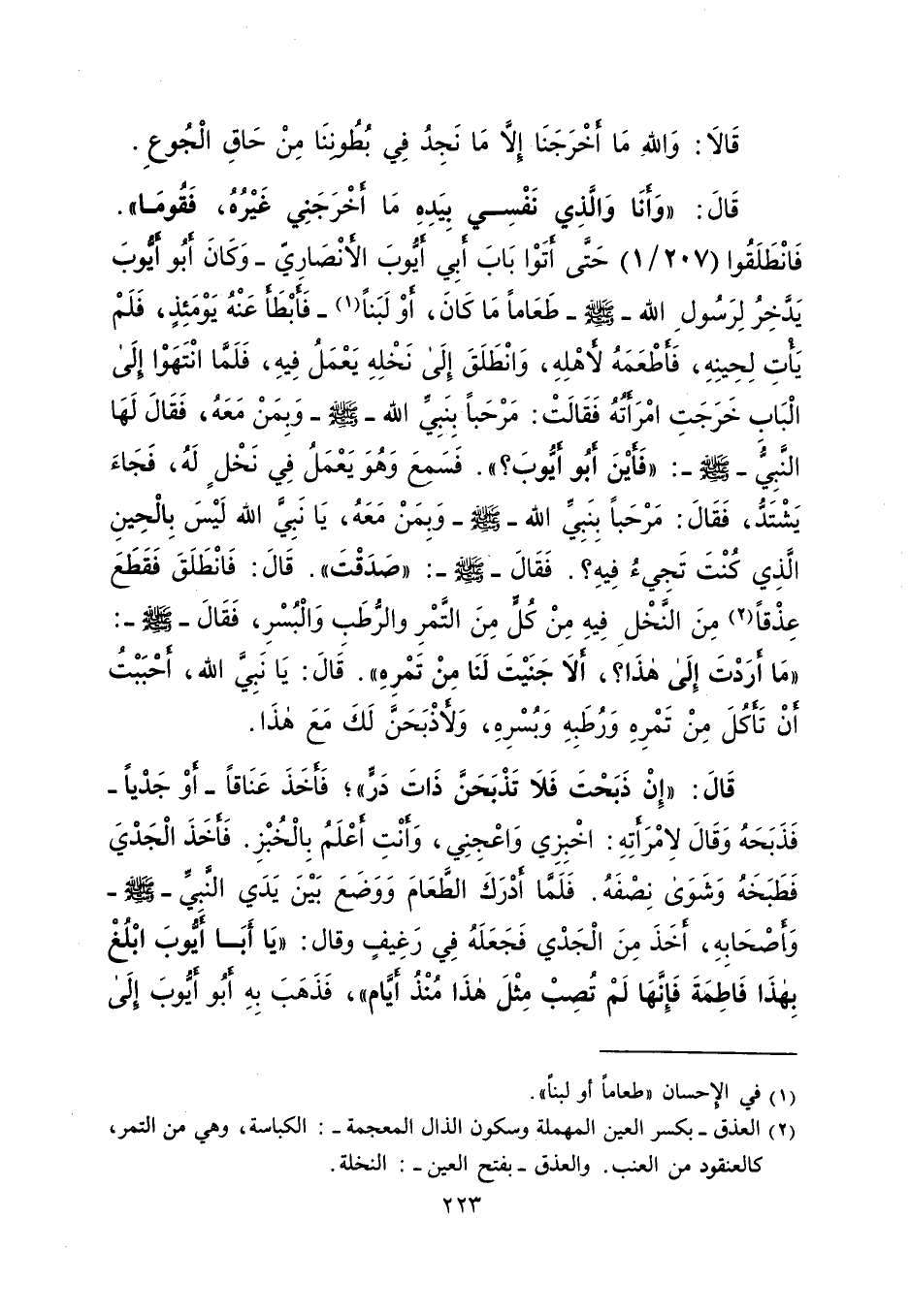 قَالا: وَاللهِ مَا أَخْرَجَنَا إلاَّ مَا نَجِدُ فِي بُطونِنَا مِنْ حَاقِ الْجُوعِ. قَالَ: "وَأنَا والذى نَفْسِي بِيَدِهِ مَا أَخْرَجَنِي غَيْرُهُ، فَقُومَا". فَانْطَلَقُوا (207/ 1) حَتَّى أتَوْا بَابَ أَبِي أَيُّوبَ الأنْصَاريّ- وَكَانَ أَبُو أَيوبَ يَدَّخِرُ لِرَسُولِ الله -صلى الله عليه وسلم- طَعَاماً مَا كَانَ، أَوْ لَبَناً (¬1) - فَأَبْطَا عَنْهُ يَوْمَئِذٍ، فَلَمْ يَأْتِ لِحِينِهِ، فَأَطْعَمَهُ لأَهْلِهِ، وَانْطَلَقَ إِلَى نَخْلِهِ يَعْمَلُ فِيهِ، فَلَمَّا انْتَهَوْا إلَى الْبَاب خَرَجَتِ امْرأَتهُ فَقَالَتْ: مَرْحَباً بِنَبِيِّ الله -صلى الله عليه وسلم- وَبِمَنْ مَعَهُ، فَقَالَ لَهَا النَّبِيّ -صلى الله عليه وسلم-: "فَأَيْنَ أَبُو أَيُّوبَ؟ ". فَسَمعَ وَهُوَ يَعْمَل فِي نَخْلٍ لَهُ، فَجَاءَ يَشْتَدُّ، فَقَالَ: مَرْحَباً بِنَبِيِّ الله -صلى الله عليه وسلم- وَبِمَنْ مَعَهُ، يَا نَبِيَّ الله لَيْسَ بِالْحِينِ الّذِي كُنْتَ تَجيءُ فِيهِ؟. فَقَالَ -صلى الله عليه وسلم-: "صَدَقْتَ". قَالَ: فَانْطَلَقَ فَقَطَعَ عِذْقاً (¬2) مِنَ الَنَّخْلِ فِيهِ مِنْ كُلٍّ مِنَ التَّمْرِ والرُّطَب وَالْبُسْرِ، فَقَالَ -صلى الله عليه وسلم-: "مَا أرَدْتَ إِلَى هذَا؟، أَلَا جَنَيْتَ لَنَا مِنْ تَمْرِهِ". قًالَ: يَا نَبِيّ الله، أحْبَبْتُ أن تَأكُلَ مِنْ تَمْرِهِ وَرُطَبِهِ وَبُسْرِهِ، وَلأذْبَحَنَ لَكَ مَعَ هذَا. قَالَ: "إِنْ ذَبَحْتَ فَلاَ تَذْبَحَنَّ ذَاتَ دَرٍّ"؟ فَأخَذَ عَنَاقاً- أوْ جَدْياً- فَذَبَحَهُ وَقَالَ لامْرأَتهِ: اخْبِزِي وَاعْجِنِي، وَأَنتِ أَعلَمُ بِالْخُبْزِ. فَاخذَ الْجَدْيَ فَطَبَخَهُ وَشَوَى نِصْفَهُ. فَلَمَّا أدْرَكَ الطعَامَ وَوَضَعَ بَيْنَ يَدَي النَّبيِّ -صلى الله عليه وسلم- وَأَصْحَابِهِ، أَخَذَ مِنَ الْجَدْي فَجَعَلَهُ فِي رَغِيفٍ وقال: "يَا أَبَا أَيُّوبَ ابْلُغْ بِهذَا فَاطِمَةَ فَإِنَّهَا لَمْ تُصِبْ مِثْلَ هذَا منْذُ أَيَّام "، فَذَهَبَ بِهِ أَبُو أَيُّوبَ إلَى