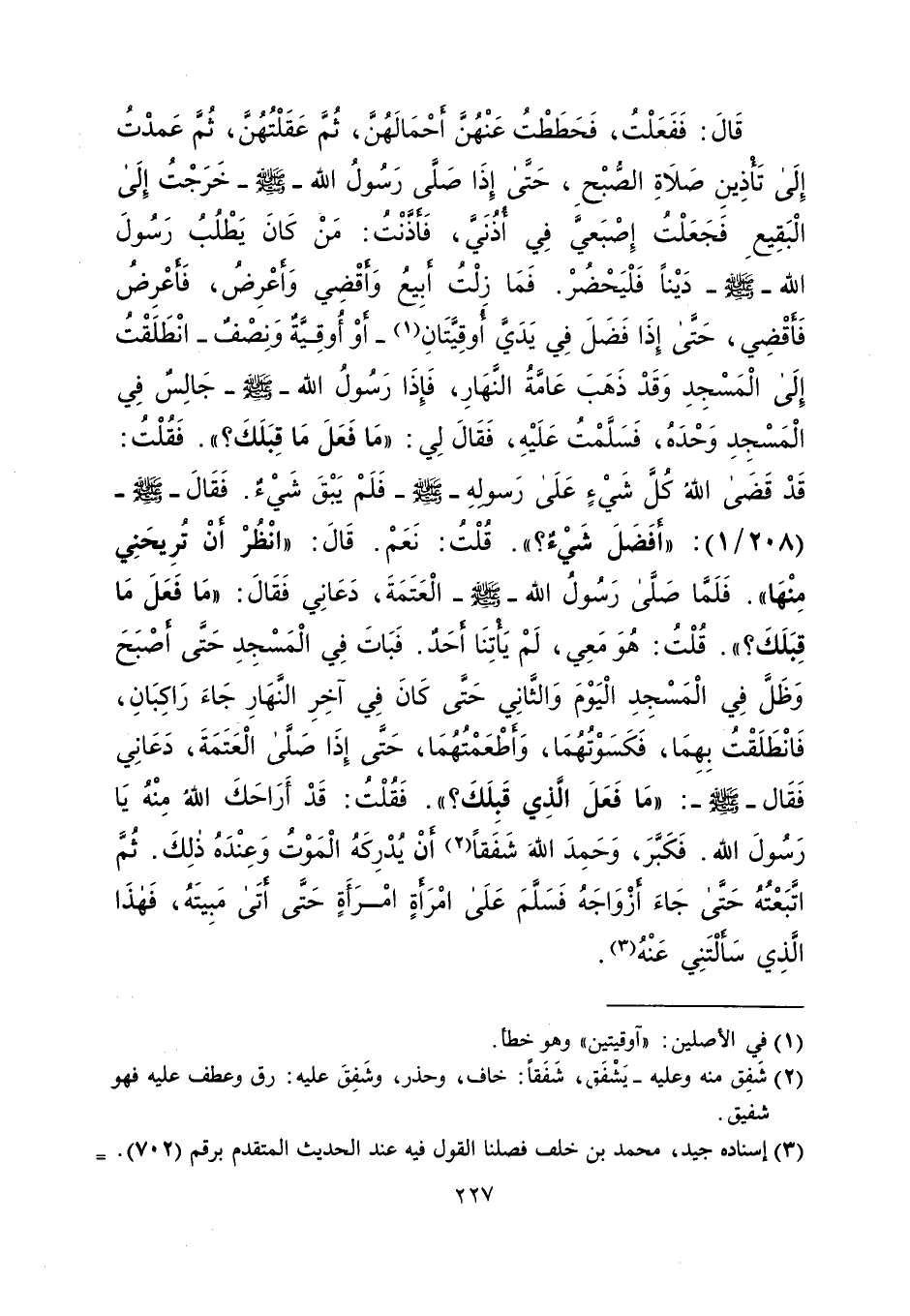 قَالَ: فَفَعَلْتُ، فَحَطَطْتُ عَنْهُنَّ أَحْمَالَهُنَ، ثُمّ عَقَلْتُهُنَ، ثُمّ عَمدْتُ إِلَى تَأَذِينِ صَلاةِ الصُّبْحِ، حَتَّى إِذَا صَلى رَسُولُ الله -صلى الله عليه وسلم- خَرَجْتُ إِلَى الْبَقِيعِ فَجَعَلْتُ إِصْبَعيَّ فِي أذُنَى، فَأَذَّنْتُ: مَنْ كَانَ يَطْلُبُ رَسُولَ الله -صلى الله عليه وسلم- دَيْناً فَلْيَحْضُرْ. فَمَا زلْتُ أَبِيعُ وَأَقْضِي وَأَعْرِضُ، فَأَعْرِضُ فَأَقْضِي، حَتَّى إِذَا فَضَلَ فِي يَدَيَّ أُوقِيَّتَانِ (¬1) - أَوْ أُوقِيةٌ وَنِصْفٌ - انْطَلَقْتُ إِلَى الْمَسْجِدِ وَقَدْ ذَهَبَ عَامَّةُ النَّهَارِ، فَإِذَا رَسُولُ الله -صلى الله عليه وسلم- جَالِسٌ فِي الْمَسْجِدِ وَحْدَهُ، فَسَلَّمْتُ عَلَيْهِ، فَقَالَ لِي: "مَا فَعَلَ مَا قِبَلَكَ؟ ". فَقُلْتُ: قَدْ قَضَى اللهُ كُل شَيْءٍ عَلَى رَسولهِ -صلى الله عليه وسلم- فَلَمْ يَبْقَ شَيْءٌ. فَقَالَ -صلى الله عليه وسلم- (208/ 1): "أفَضَلَ شَيْءٌ؟ ". قُلْتُ: نَعَمْ. قَالَ: "انْظُرْ أَنْ تُرِيحَنِي مِنْهَا". فَلَمَّا صَلى رَسُولُ الله -صلى الله عليه وسلم- الْعَتَمَةَ، دَعَانِي فَقَالَ: "مَا فَعَلَ مَا قِبَلَكَ؟ ". قُلْتُ: هُوَ مَعِي، لَمْ يَأْتِنَا أَحَدٌ. فَبَاتَ فِي الْمَسْجِدِ حَتَّى أصْبَحَ وَظَل فِي الْمَسْجِدِ الْيَوْمَ وَالثَّانِي حَتَّى كَانَ فِي آخِرِ النَهَارِ جَاءَ رَاكِبَانِ، فَانْطَلَقْتُ بِهِمَا، فَكَسَوْتُهُمَا، وَأَطْعَمْتُهُمَا، حَتَّى إِذَا صَلى الْعَتَمَةَ، دَعَانِي فَقَال-صلى الله عليه وسلم-: "مَا فَعَلَ الّذِي قَبِلَكَ؟ ". فَقُلْتُ: قَدْ أَرَاحَكَ اللهُ مِنْهُ يَا رَسُولَ الله. فَكَبَّرَ، وَحَمِدَ اللهَ شَفَقاً (¬2) أن يُدْرِكَهُ الْمَوْتُ وَعِنْدَهُ ذلِكَ. ثُمَّ اتَبَعْتُهُ حَتَّى جَاءَ أزْوَاجَهُ فَسَلّمَ عَلَى امْراةٍ امْرَأَةٍ حَتَّى أتَى مَبِيتَهُ، فَهذَا الّذِي سَألْتَنِي عَنْهُ (¬3).