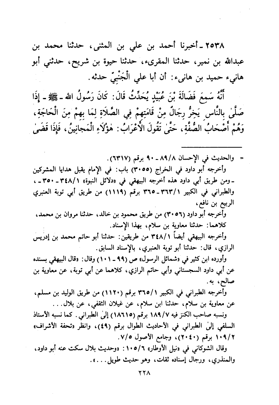 2538 - أخبرنا أحمد بن علي بن المثنى، حدثنا محمد بن عبد الله بن نمير، حدثنا المقرئ، حدثنا حيوة بن شريح، حدثني أبو هانئ حميد بن هانئ: أن أبا علي الْجَنْبِيّ حدثه. أَنَّهُ سَمعَ فَضَالَةَ بْنَ عُبَيْدٍ يُحَدِّثُ قَالَ: كَانَ رَسُولُ الله- صلى الله عليه وسلم- إذَا صَلَّى بِالنَّاسِ يَخِرُّ رِجَالٌ مِنْ قَامَتِهمْ فِي الصَّلاةِ لِمَا بِهِمِ الْحَاجَةِ، وَهُمْ أَصْحَابُ الصُّفَةِ، حتى تَقُولَ الأَعْرَابُ: هؤلاَءِ الْمَجانِينُ، فَإذَا قَضَى