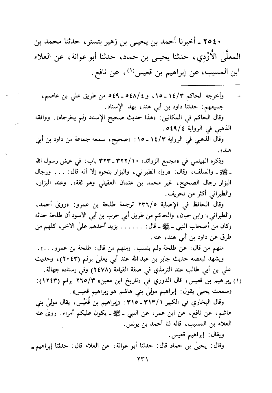 2540 - أخبرنا أحمد بن يحيى بن زهير بتستر، حدثنا محمد بن المعلى الأَوْدِي، حدثنا يحيى بن حماد، حدثنا أبو عوانة، عن العلاء ابن المسيب، عن إبراهيم بن قعيس (¬1)، عن نافع.