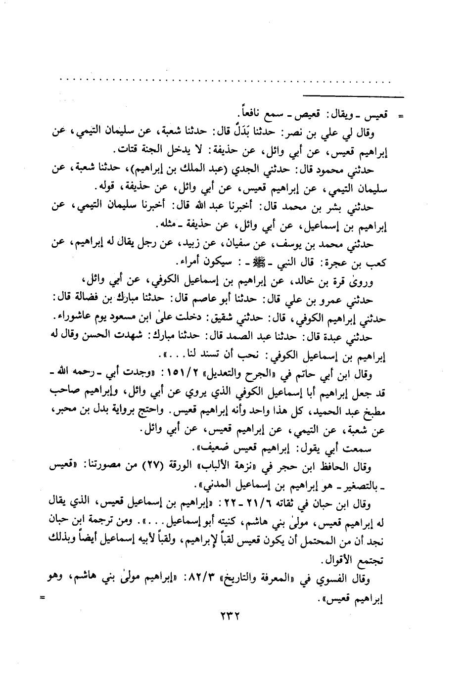 وقال ابن أبي حاتم في "الجرح والتعديل" 2/ 151: "وجدت أبي -رحمه الله- قد جعل إبراهيم أبا إسماعيل الكوفي الذي يروي عن أبي وائل، وإبراهيم صاحب مطبخ عبد الحميد، كل هذا واحد وأنه إبراهيم قعيس. واحتج برواية بدل بن محبر، عن شعبة، عن التيمي، عن إبراهيم قعيس، عن أبي وائل.