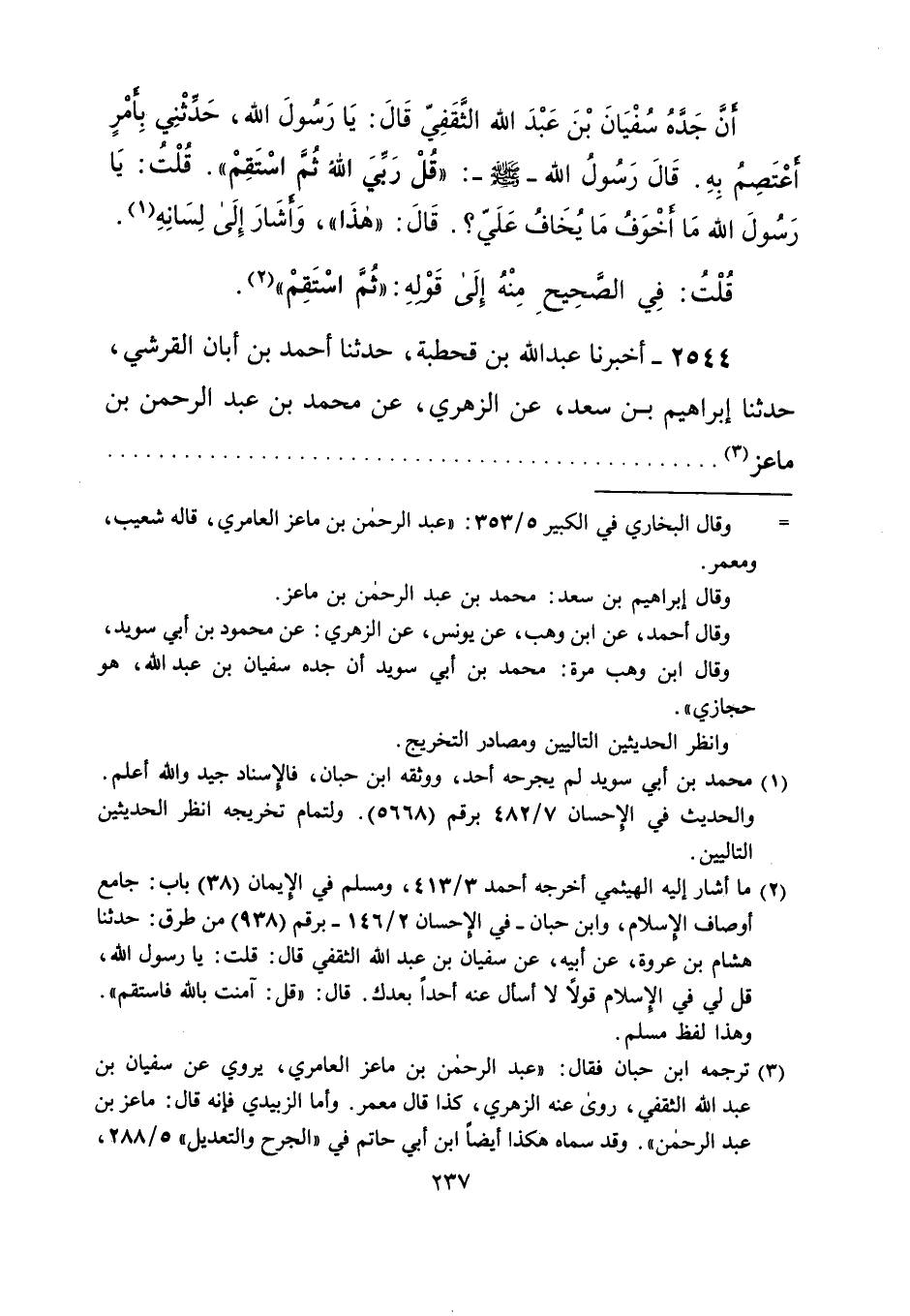 (¬3) ترجمه ابن حبان فقال: "عبد الرحمن بن ماعز العامري، يروي عن سفيان بن عبد الله الثقفي، روى عنه الزهري، كذا قال معمر. وأما الزبيدىِ فإنه قال: ماعز بن عبد الرحمن". وقد سماه هكذا أيضاً ابن أبي حاتم في "الجرح والتعديل" 5/ 288،
