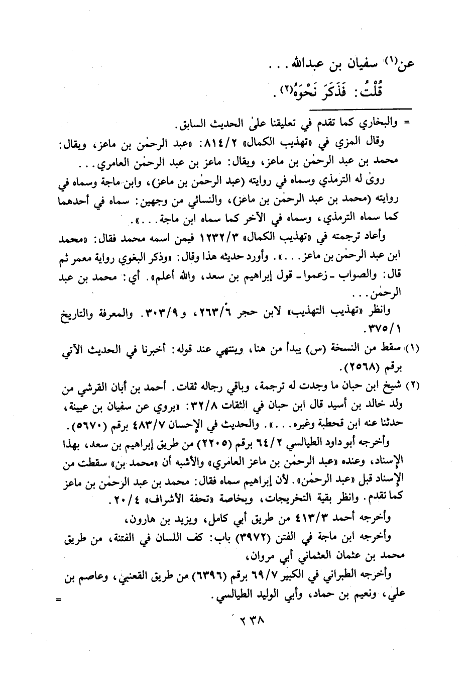 وأعاد ترجمته في "تهذيب الكمال" 3/ 1232 فيمن اسمه محمد فقال: "محمد ابن عبد الرحمن بن ماعز ... ". وأورد حديثه هذا وقال: "وذكر البغوي رواية معمر ثم قال: والصواب- زعموا- قول إبراهيم بن سعد، والله أعلم". أي: محمد بن عبد الرحمن ....