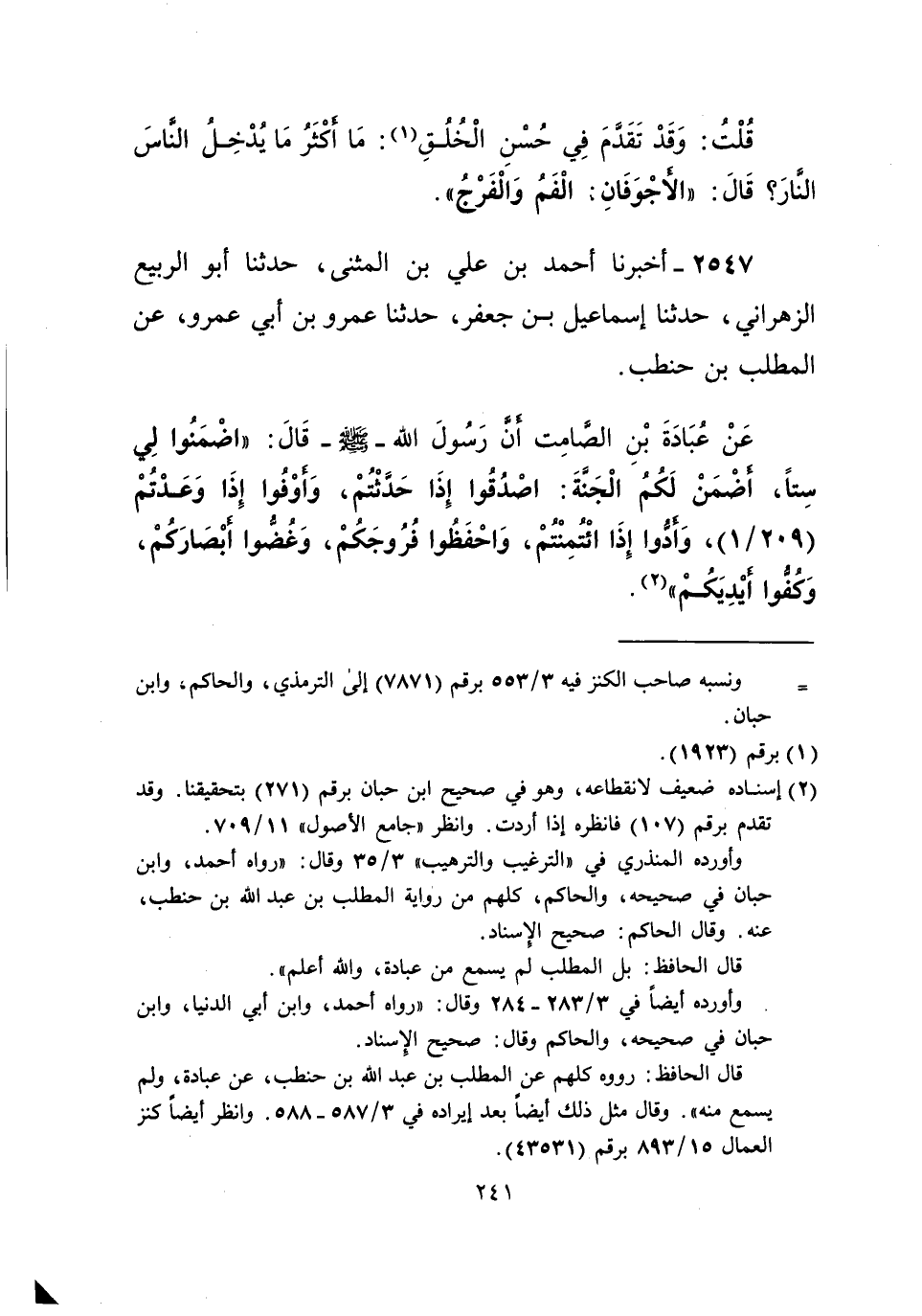 قال الحافظ: رووه كلهم عن المطلب بن عبد الله بن حنطب، عن عبادة، ولم يسمع منه". وقال مثل ذلك أيضاً بعد إيراده في 3/ 587 - 588. وانظر أيضاً كنز العمال 15/ 893 برقم (43531).