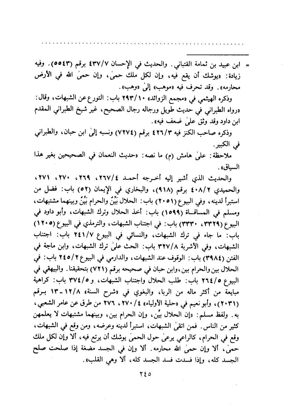 ملاحظة: على هامش (م) ما نصه: "حديث النعمان في الصحيحين بغير هذا السياق". والحديث الذي أشير إليه أخرجه أحمد 4/ 267، 269، 270، 271، والحميدي 2/ 408 برقم (918)، والبخاري في الإيمان (52) باب: فضل من استبرأ لدينه، وفي البيوع (2051) باب: الحلال بَين والحرام بَين وبينهما مشتبهات، ومسلم في المساقاة (1599) باب: أخذ الحلال وترك الشبهات، وأبو داود في البيوع (3329، 3330) باب: في اجتناب الشبهات، والترمذي في البيوع (1205) باب: ما جاء في ترك الشبهات، والنسائي في البيوع 7/ 241 باب: اجتناب الشبهات، وفي الأشربة 8/ 327 باب: الحث على ترك الشبهات، وابن ماجه في الفتن (3984) باب: الوقوف عند الشبهات، والدارمي في البيوع 2/ 245 باب: في الحلال بين والحرام بين، وابن حبان في صحيحه برقم (721) بتحقيقنا. والبيهقي في البيوع 5/ 264 باب: طلب الحلال واجتناب الشبهات، و 5/ 374 باب: كراهية مبايعة من أكثر ماله من الربا، والبغوي في "شرح السنة" 8/ 12 - 13 برقم