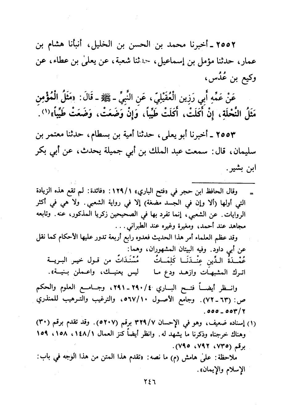 = وقال الحافظ ابن حجر في "فتح الباري" 1/ 129: "فائدة: لم تقع هذه الزيادة التي أولها (ألا وإن في الجسد مضغة) إلا في رواية الشعبي. ولا هي في أكثر الروايات. عن الشعبي، إنما تفرد بها في الصحيحين زكريا المذكور، عنه. وتابعه مجاهد عند أحمد، ومغيرة وغيره عند الطبراني ...