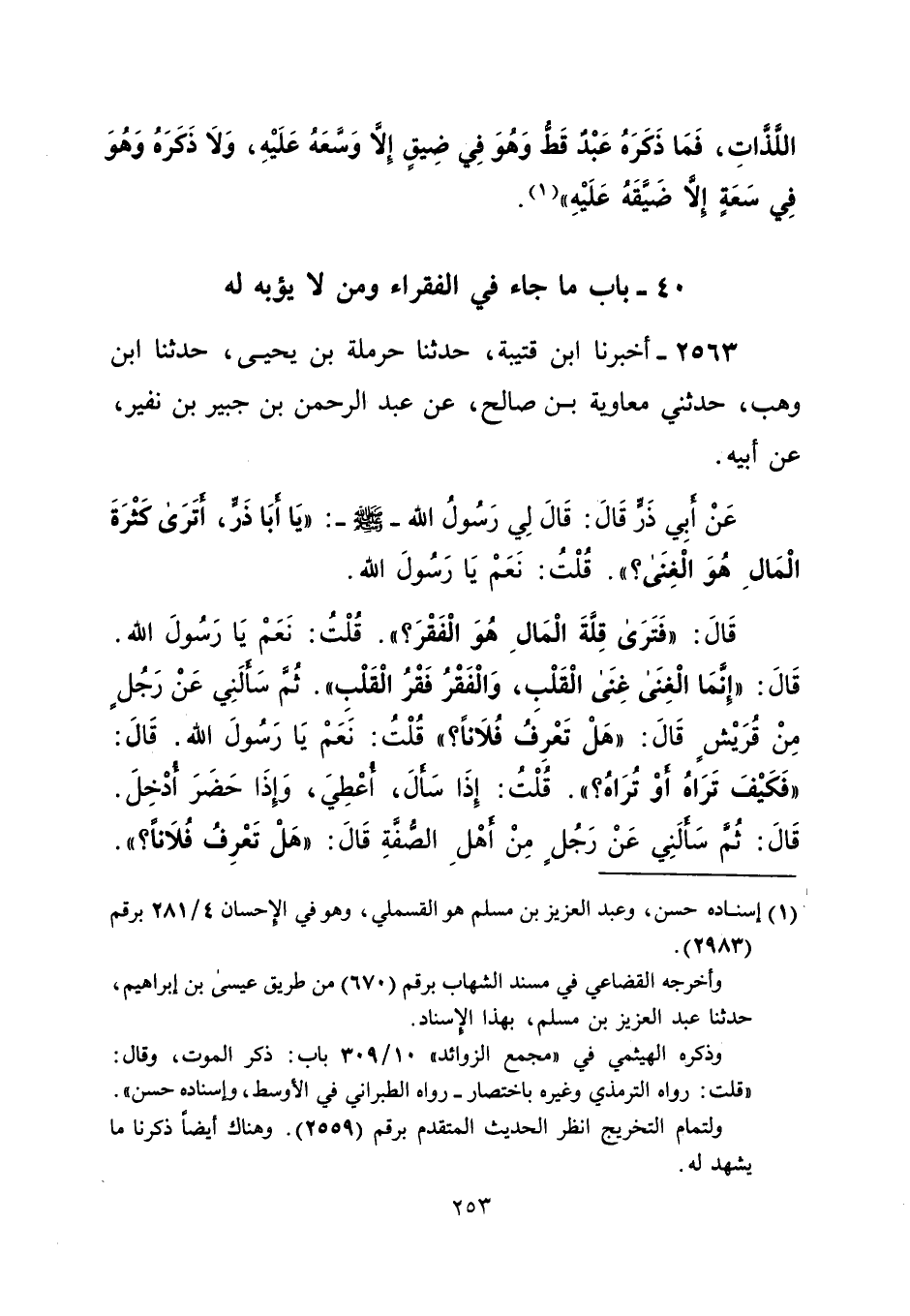 قَالَ: "فَتَرَى قِلَّةَ الْمَالِ هُوَ الْفَقْرَ؟ ". قُلْتُ: نَعَمْ يَا رَسُول الله. قَالَ: "إِنَّمَا الْغِنَى غنى الْقَلْبِ، وَالْفَقْرُ فَقْرُ الْقَلْبِ". ثُم سَألَنِي عَنْ رَجُل مِنْ قُرَيْش قَالَ: "هَلْ تَعْرِفُ فُلاناً؟ " قُلْتُ: نَعَمْ يَا رَسُول الله. قَالَ: "فَكَيْفَ تَرَاهُ أوْ تُرَاهُ؟ ". قُلْتُ: إِذَا سَأَلَ، أعْطِيَ، وَإذَا حَضَرَ أُدْخِلَ. قَالَ: ثُمَّ سَألَنِي عَنْ رَجُلٍ مِنْ أهْلِ الصُّفَّةِ قَالَ: "هَلْ تعرف فُلاَناً؟ ".