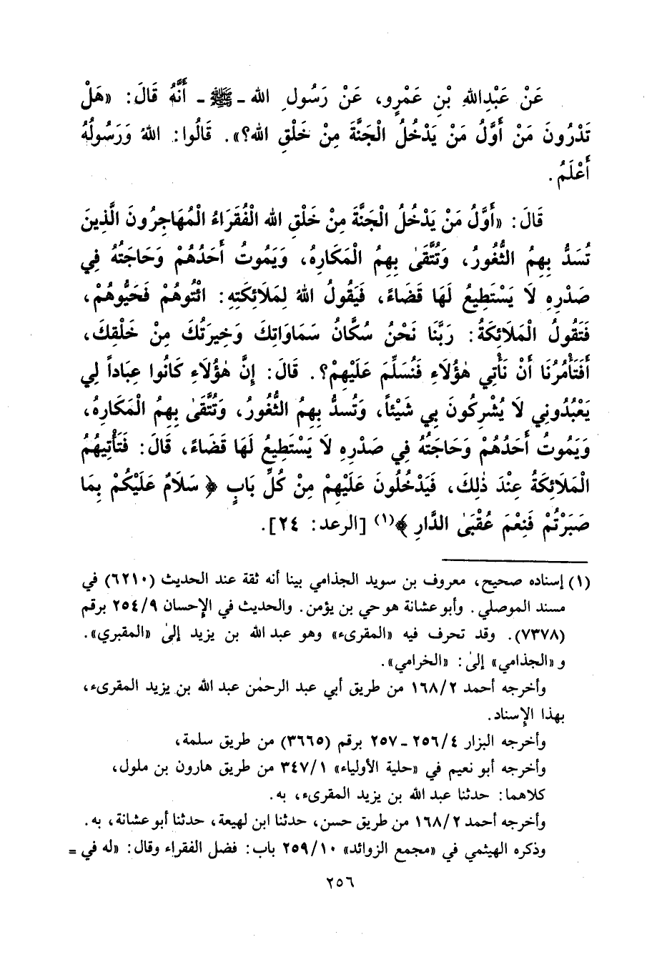 عَنْ عَبْدِ اللهِ بْنِ عَمْرٍ و، عَنْ رَسولِ الله -صلى الله عليه وسلم- أنَّهُ قَالَ.: "هَلْ تَدْرُونَ مَنْ أَوَّلُ مَنْ يدخل الْجَنَّةَ مِنْ خَلْقِ الله؟. قَالُوا: الله وَرَسُولُهُ أعْلَمُ. قَالَ: "أوَّلُ مَنْ يدخل الْجَنَّةَ مِنْ خَلْقِ الله الْفُقَرَإءُ الْمُهَاجِرُونَ الذين تُسَدُّ بِهِمُ الثُّغُورُ، وَتُتَّقَى بِهِمُ الْمَكَارِهُ، وَيَمُوتُ أَحَدُهُمْ وَحَاجَتهُ فِي صَدْرِهِ لا يَسْتَطِيعُ لَهَا قَضَاءً، فَيَقُولُ اللهُ لِمَلائِكَتِهِ: ائْتُوهُمْ فَحَيُّوهُمْ، فَتَقُولُ الْمَلائكَةُ: رَبَّنَا نَحْنُ سُكَّانُ سَمَاوَاتِكَ وَخِيرَتُكَ مِنْ خَلْقِكَ، أفَتَأمُرُنَا أنْ نَأَتِي هؤُلاَءِ فَنُسَلِّمَ عَلَيْهِمْ؟. قَالَ: إنَّ هؤلاَءِ كَانُوا عِبَاداً لِي يَعْبُدُونِي لا يُشْرِكُونَ بِي شَيْئاً، وَتُسدُّ بِهِمُ الثُّغُورُ، وَتُتَّقَى بِهِمُ الْمَكَارِهِ، وَيَمُوتُ أحَدُهُمْ وَحَاجَتُهُ فِي صَدْرِهِ لا يَسْتَطِيعُ لَهَا قَضَاءً، قَالَ: فَتَأْتِيهُمُ الْمَلائِكَةُ عِنْدَ ذلِكَ، فَيَدْخُلُونَ عَلَيْهِمْ مِنْ كُلِّ بَابٍ {سَلَامٌ عَلَيْكُمْ بِمَا صَبَرْتُمْ فَنِعْمَ عُقْبَى الدَّارِ} (¬1) [الرعد: 24].