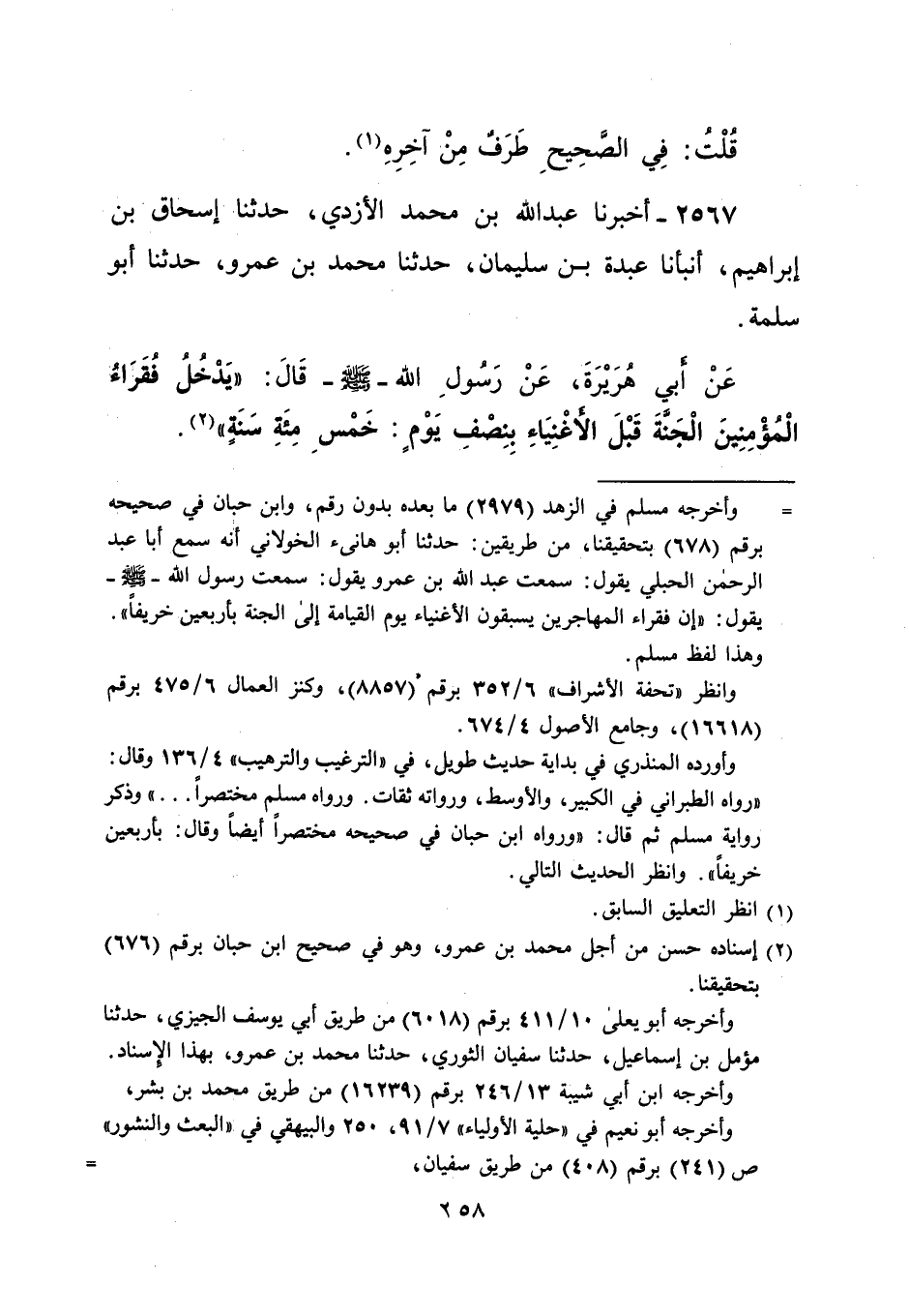 عَنْ أبي هريرة، عَنْ رَسُولِ الله-صلى الله عليه وسلم- قَالَ: "يَدْخل فقَراءُ المؤمنين الْجَنَّةَ قَبْلَ الأغنِيَاءِ بِنِصْفِ يَوْم: خَمْسِ مِئَةِ سنة" (¬2).