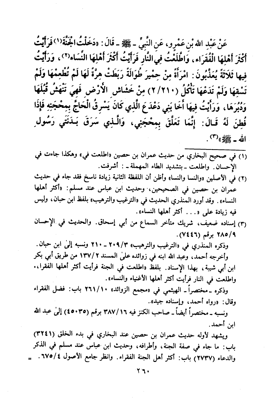 عَنْ عَبْدِ الله بْنِ عَمْرٍو، عَنِ النَّبِيِّ-صلى الله عليه وسلم- قَالَ: "دَخَلْتُ الْجَنَّةَ (¬1) فَرَأيت أَكْثَرَ أَهْلِهَا الْفقَرَاء، وَاطَّلَعْتُ فِي النَّارِ فَرَأَيْت أَكْثَرَ أَهْلِهَا النِّسَاء (¬2)،وَرَأَيْتُ فِيها ثَلاثَةً يُعَذَّبُونَ: امْرَأةً مِنْ حِمْيرَ طُوَالَة رَبَطَتْ هِرَّةً لَهَا لَمْ تُطْعِمْهَا وَلَمْ تَسْقِهَا وَلَمْ تَدَعْهَا تَأْكُلُ (210/ 2) مِنْ خَشَاشِ الأَرْضِ فَهِيَ تَنْهَشُ قُبُلَهَا وَدُبُرَهَا، وَرَأيْتُ فِيهَا أَخَا بَنِي دَعْدَعَ الذِي كَانَ يَسْرِقُ الْحَاجَّ بِمِحْجَنِهِ فَإذَا فُطِنَ لَه قَالَ: إنمَا تَعَلَّقَ بِمِحْجَنِي، والذى سَرَقَ بَدَنَتَي رَسُولِ الله -صلى الله عليه وسلم-" (¬3).