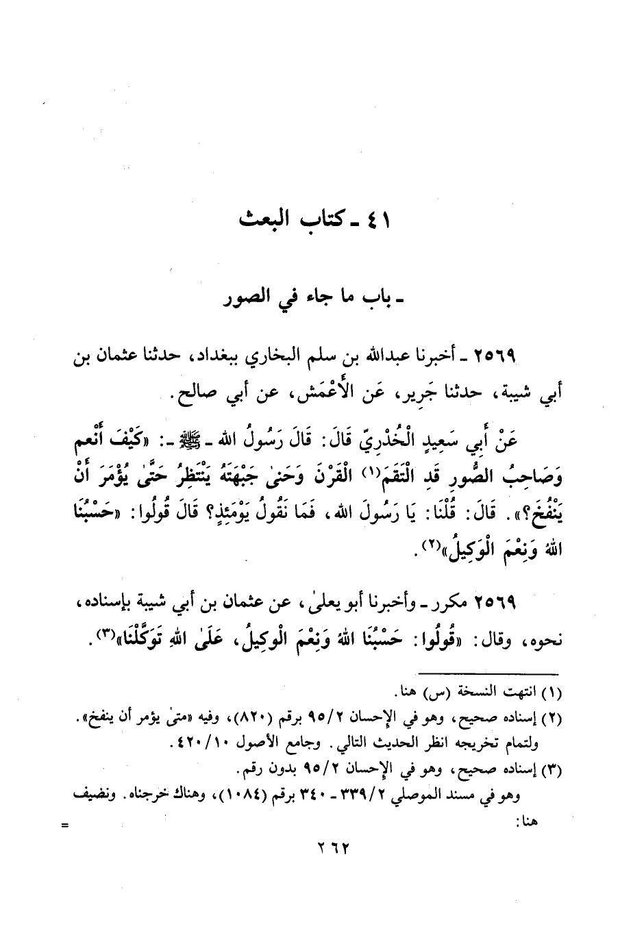 عَنْ أبِي سعيد الْخُدْرِيّ قَالَ: قَالَ رَسُولُ الله -صلى الله عليه وسلم-: "كَيْفَ أَنْعم وَصَاحِبُ الصُّورِ قَدِ الْتَقَمَ (¬1) الْقَرْنَ وَحَنى جَبْهَتَهُ يَنْتَظِرُ حَتَّى يُؤْمَرَ أَنْ يَنْفُخَ؟ ". قَالَ: قُلْنَا: يَا رَسُول الله، فَمَا نَقُولُ يَوْمَئِذٍ؟ قَالَ قُولُوا: "حَسْبُنَا اللهُ وَنِعْمَ الْوَكِيلُ" (¬2).
