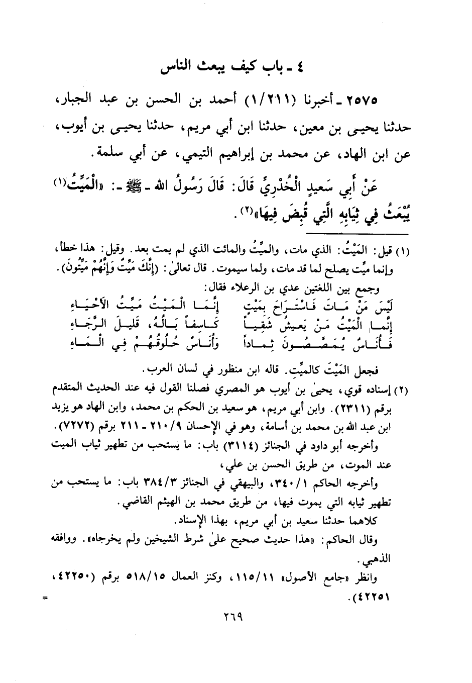 عَنْ أبِي سَعيدٍ الْخُدْرِى قَالَ: قَالَ رَسُولُ الله -صلى الله عليه وسلم-: "الْمَيِّتُ (¬1) يُبْعَثُ فِي ثِيَابِهِ الَّتِي تُبِضَ فِيهَا" (¬2).