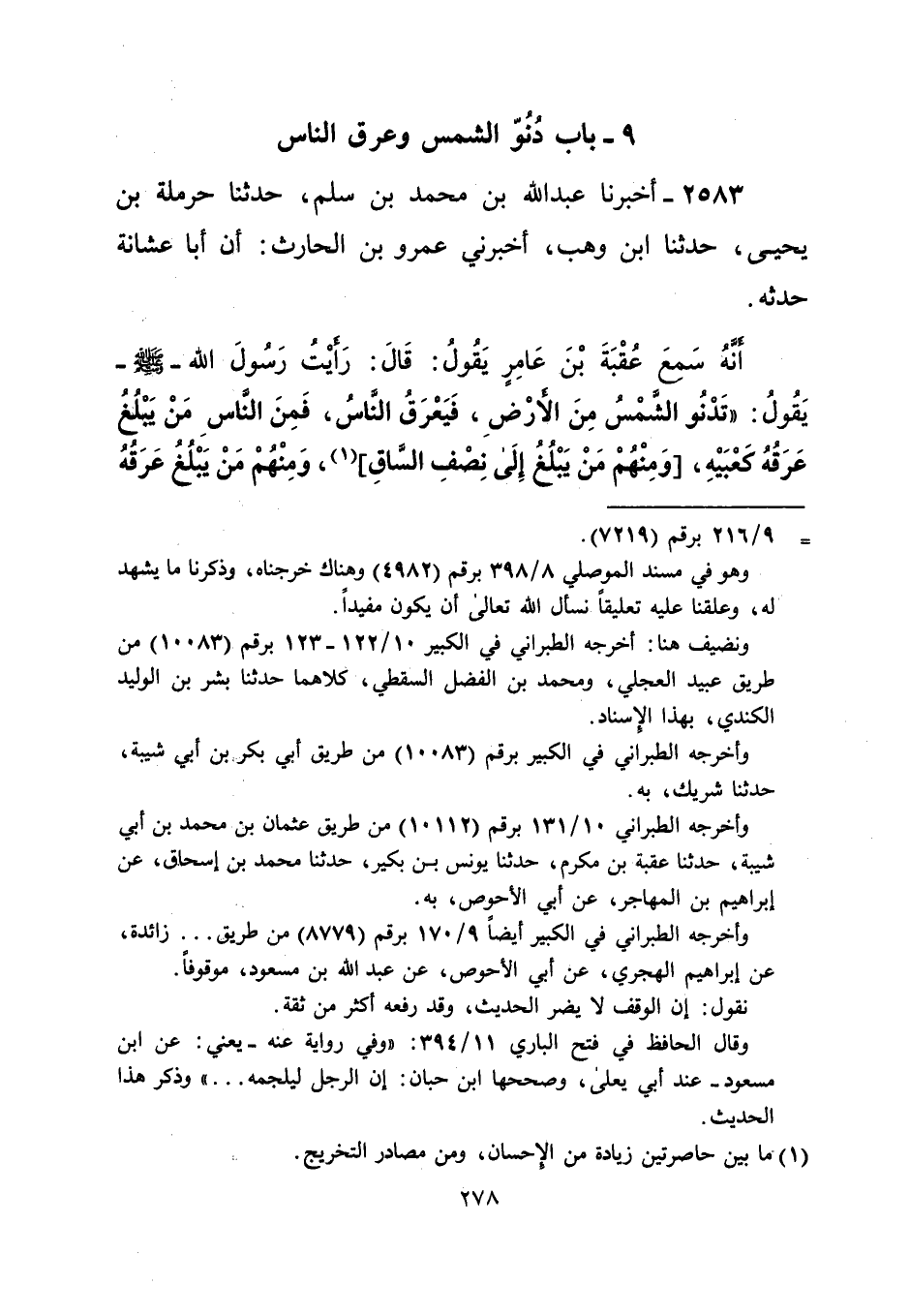 وقال الحافظ في فتح الباري 11/ 394: " وفي رواية عنه- يعني: عن ابن مسعود- عند أبي يعلى، وصححها ابن حبان: إن الرجل ليلجمه ... " وذكر هذا الحديث.