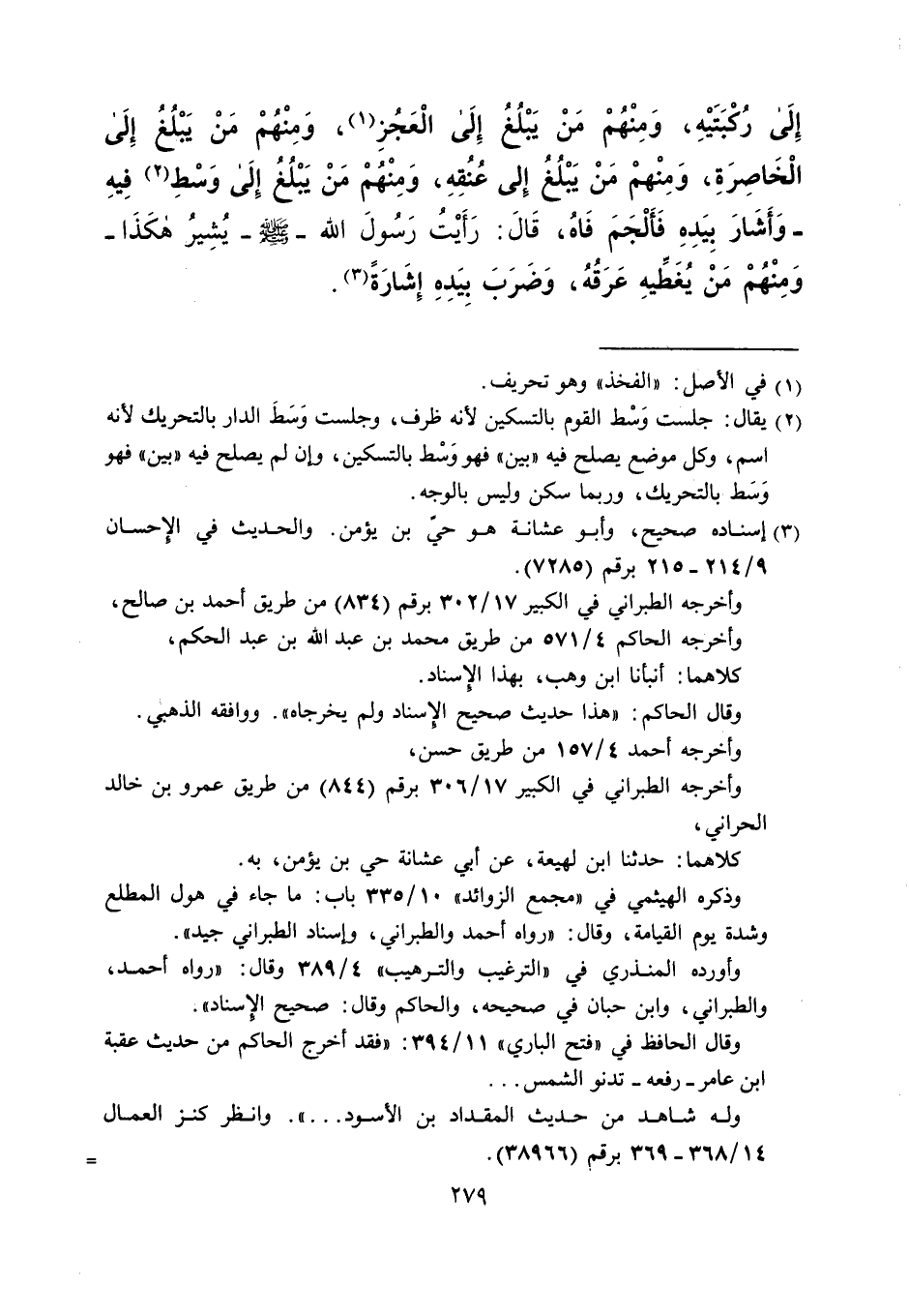 إِلَى رُكبَتَيْهِ، وَمِنْهُمْ مَنْ يَبْلُغُ إِلَى الْعَجُزِ (¬1)، وَمِنْهُمْ مَنْ يَبْلُغُ إِلَى الْخَاصِرَةِ، وَمِنْهمْ مَنْ يَبْلُغُ إِلى عُنُقِهِ، وَمِنْهُمْ مَنْ يَبْلُغُ إِلَى وَسْطِ (¬2) فِيهِ - وَأَشَارَ بِيَدِهِ فَأَلْجَمَ فَاهُ، قَالَ: رَأَيْتُ رَسُول الله -صلى الله عليه وسلم- يُشِيرُ هكَذَا- وَمِنْهُمْ مَنْ يُغَطِّيهِ عَرَقُهُ، وَضَرَبَ بِيَدِهِ إِشَارَةً (¬3).