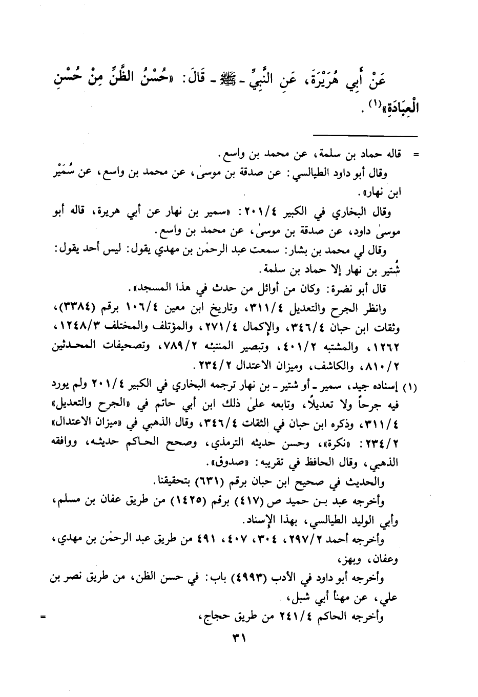 عَنْ أبِي هُرَيْرَةَ، عَنِ النَّبِيّ -صلى الله عليه وسلم- قَالَ: "حُسْنُ الظَّنَّ مِنْ حُسْنِ الْعِبَادَةِ" (¬1).