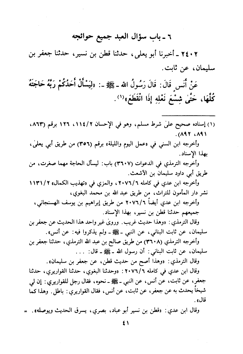 2402 - أخبرنا أبو يعلى، حدثنا قطن بن نسير، حدثنا جعفر بن سليمان، عن ثابت. عَنْ أنَسٍ قَالَ: قَالَ رَسُولُ الله -صلى الله عليه وسلم-: "لِيَسْأَلْ أَحَدُكُمْ رَبَّهُ حَاجَتَهُ كُلَّهَا، حَتَّى شِسْعَ نَعْلِهِ إِذَا انْقَطَعَ" (¬1).