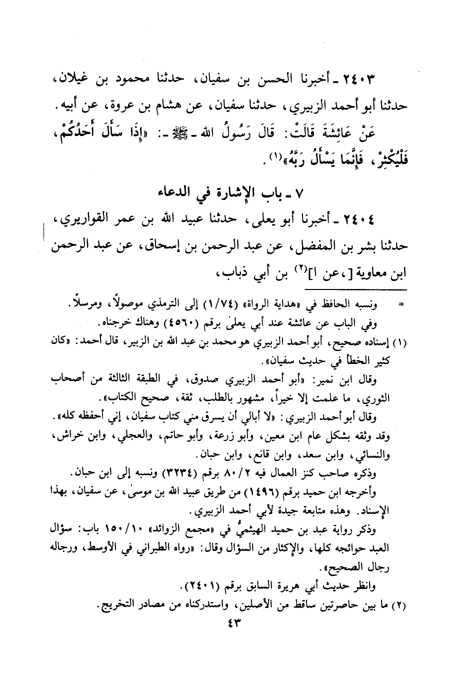 2403 - أخبرنا الحسن بن سفيان، حدثنا محمود بن غيلان، حدثنا أبو أحمد الزبيري، حدثنا سفيان، عن هشام بن عروة، عن أبيه.