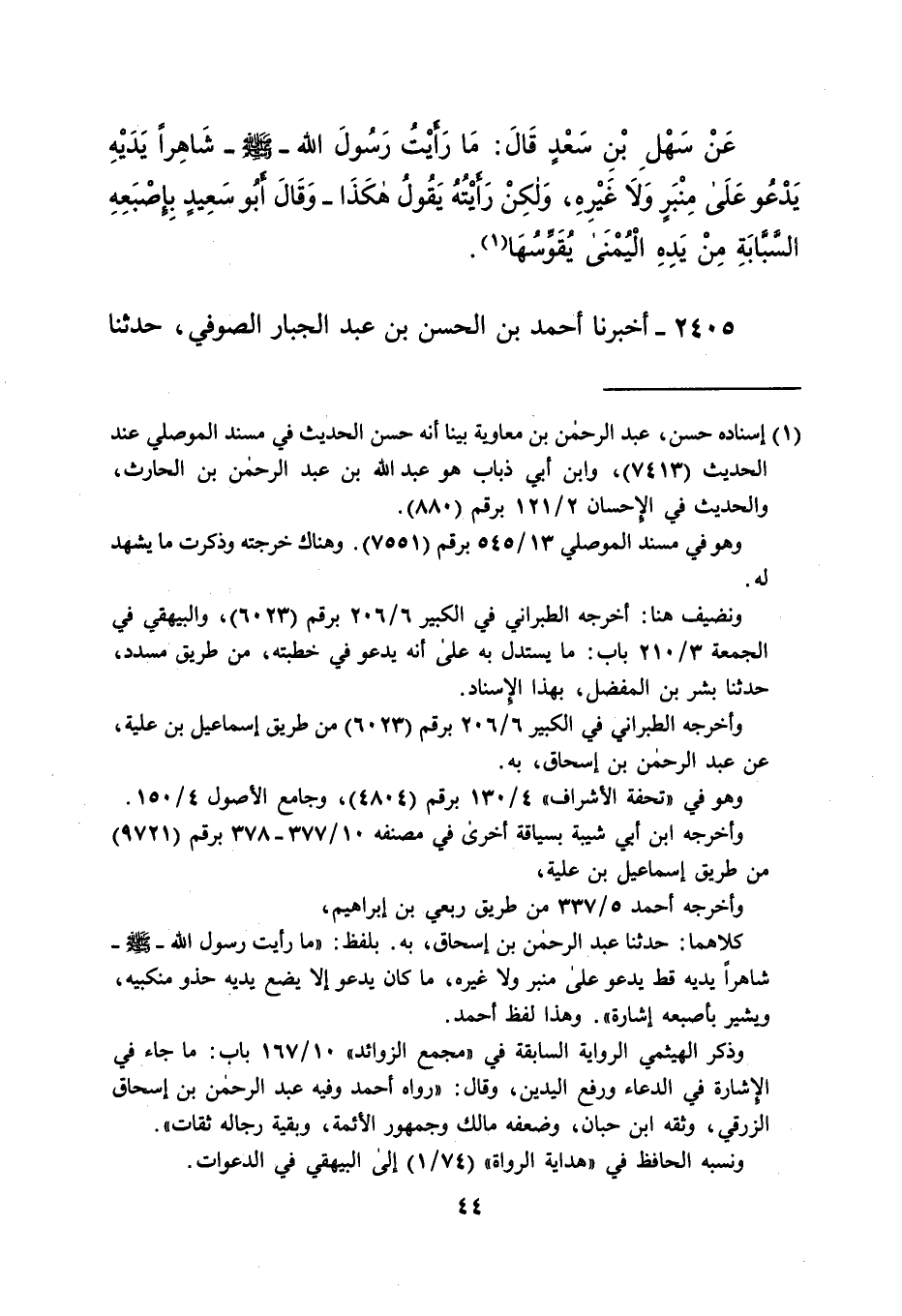عَنْ سَهْلِ بْنِ سَعْدٍ قَالَ: مَا رَأَيْتُ رَسُول الله -صلى الله عليه وسلم-شاهراً يَدَيْهِ يَدْعُو عَلَى مِنْبَرٍ وَلا غَيْرِهِ، وَلكِنْ رَأيْتُهُ يَقُولُ هكَذَا- وَقَالَ أبُو سَعِيدٍ بإصْبَعِهِ السَّبابَةِ مِنْ يَدِهِ الْيُمْنَى يُقَوِّسُهَا (¬1).